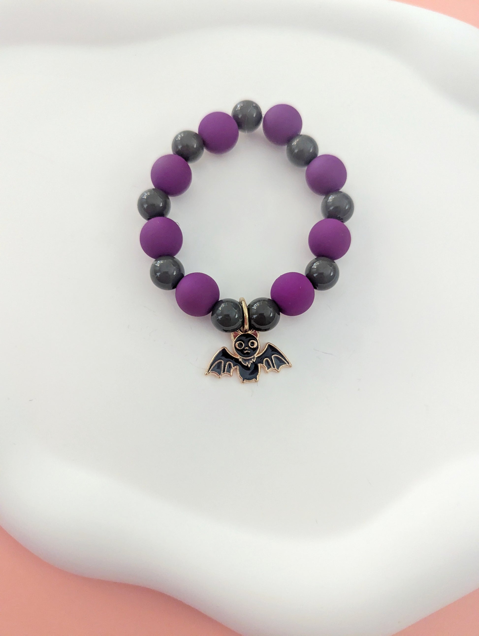 This Bat Charm Kids Bracelet features a sleek black bat charm on a vibrant purple band. The perfect accessory for any lover of all things spooky. Made with quality materials for long-lasting wear.