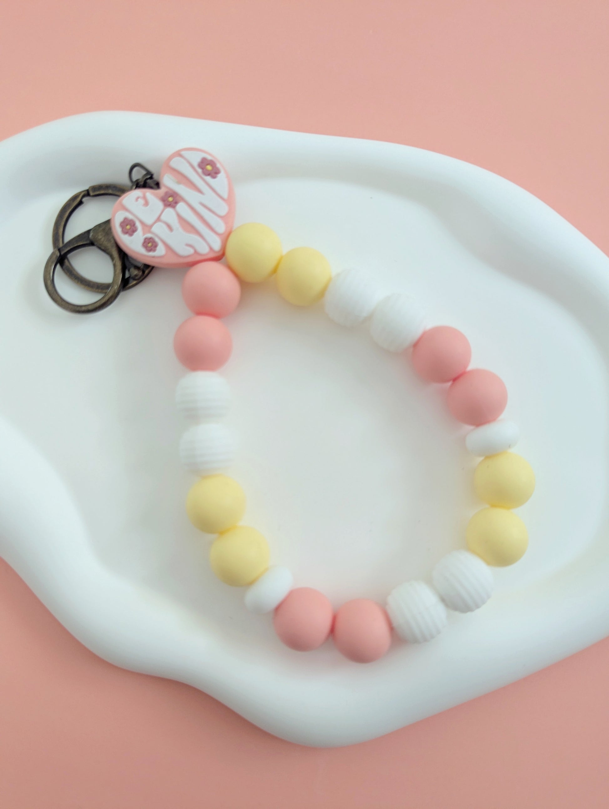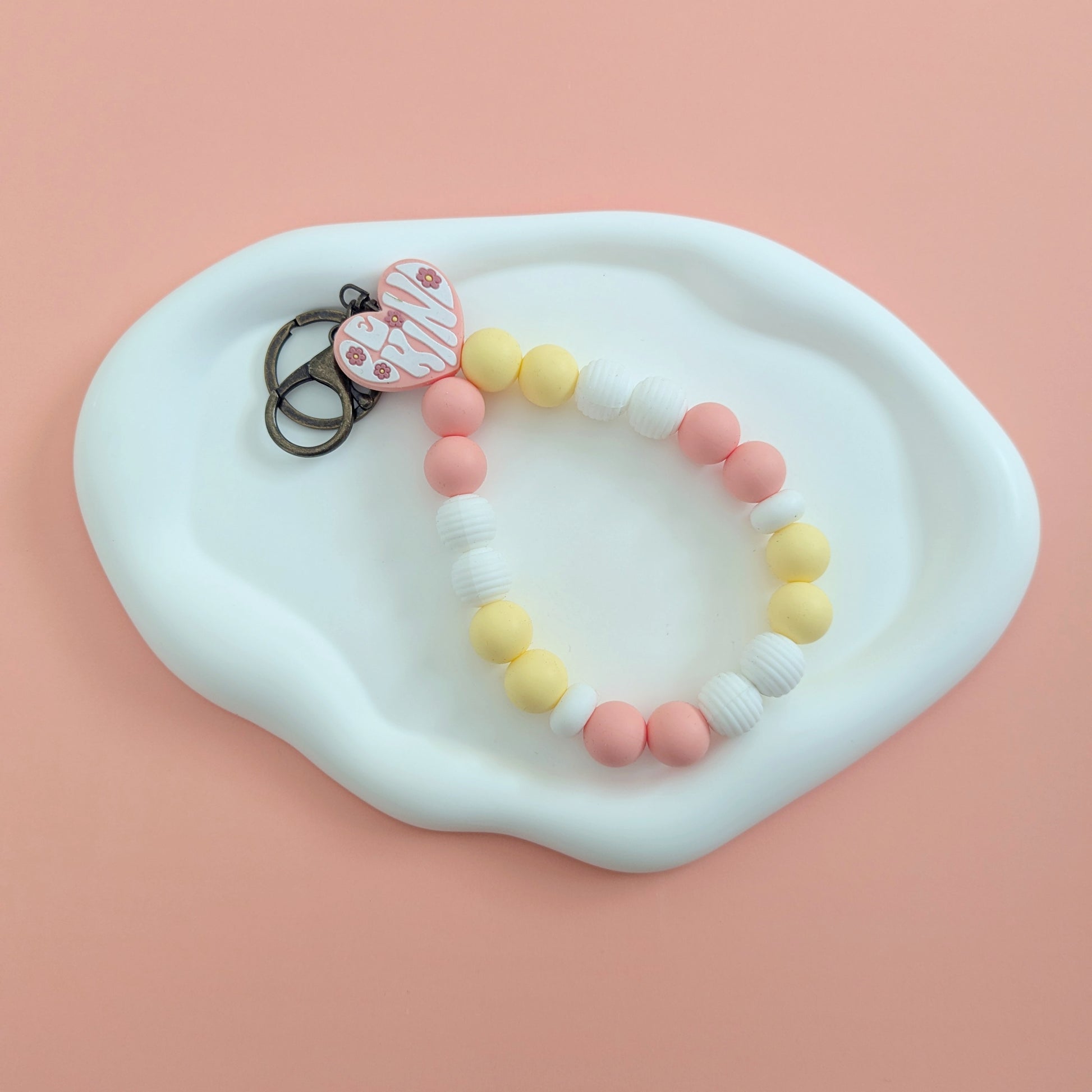 This teardrop wristlet keychain serves as a constant reminder to be kind. Its pastel yellow and orange colors add a touch of positivity to your everyday routine. Promote kindness with this stylish accessory.
