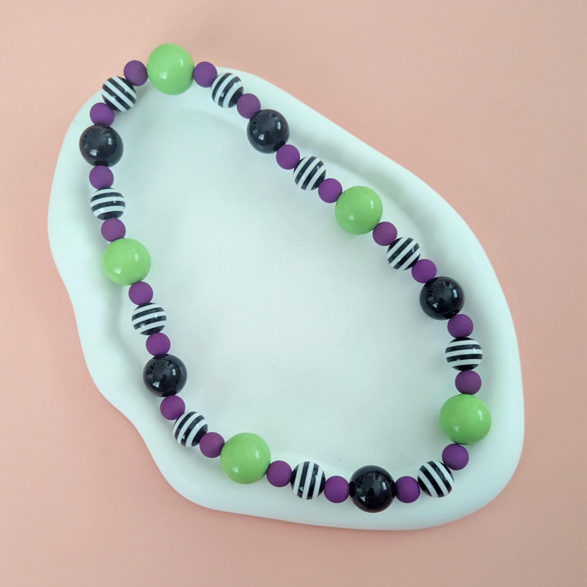 This Beetlejuice inspired necklace features a vibrant purple and green design, perfect for Halloween. The color combination is both eye-catching and reminiscent of the iconic character from the movie. Show off your love for Beetlejuice with this unique and festive necklace.
