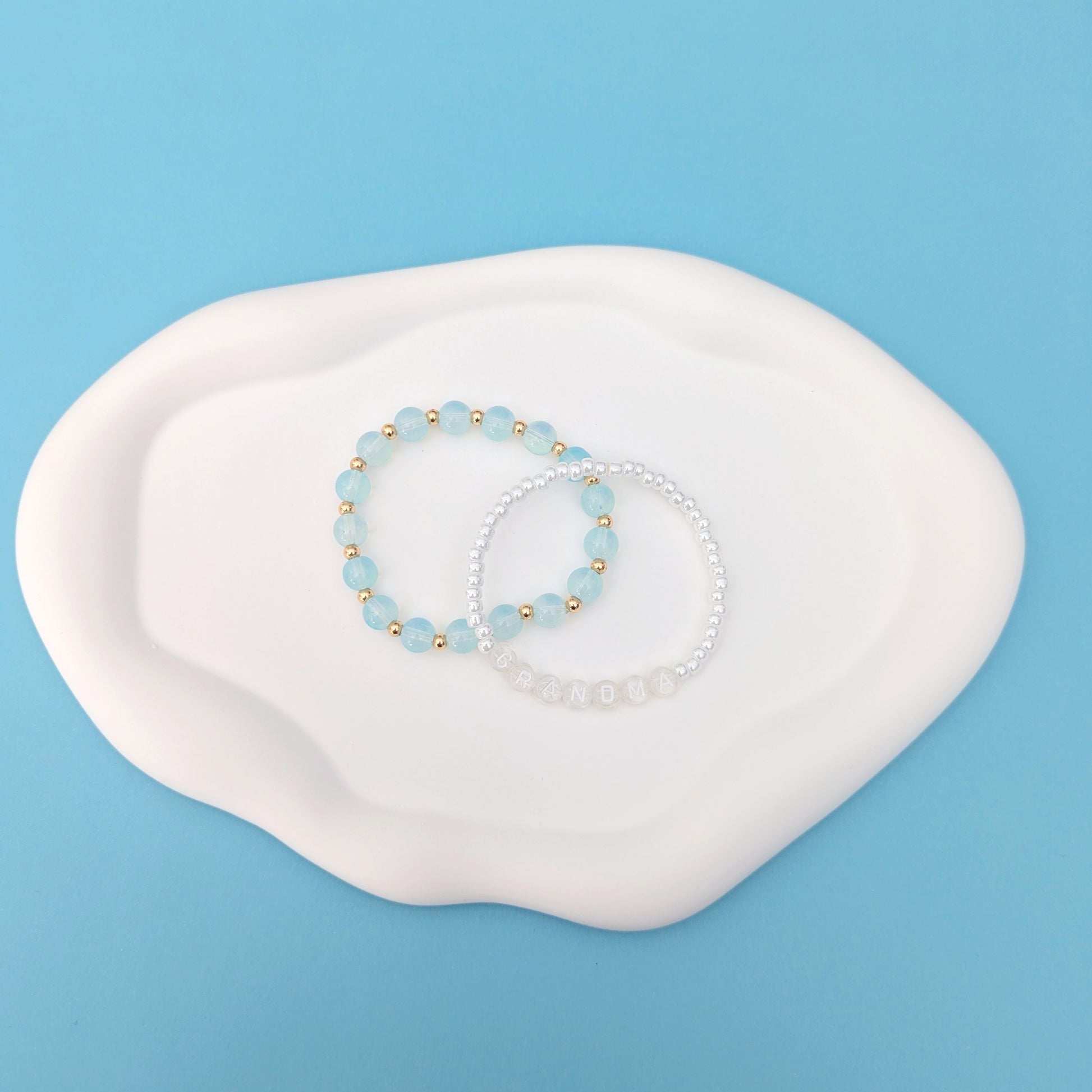 Add a touch of grandma charm with this playful stack of blue, gold, and white bracelets. Simple yet stylish, these beads will have you feeling like the coolest grandma on the block. (Your grandkids will approve!)