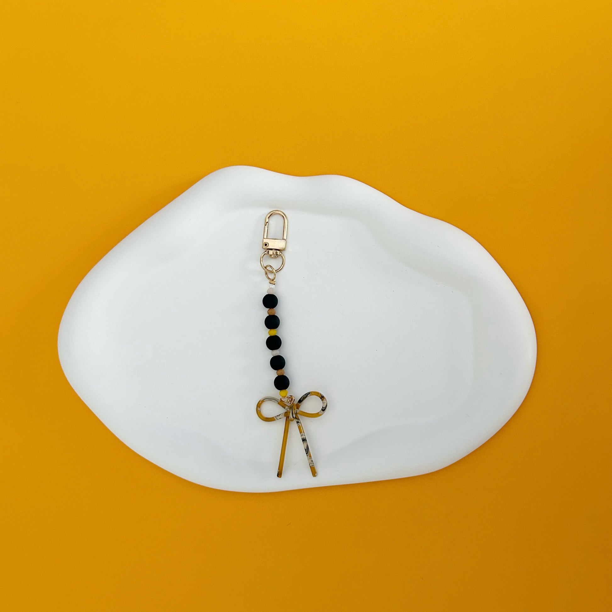 Add a splash of fun to your favorite bag with this playful Bow Bag Charm. Featuring vibrant black and yellow beads and a big yellow bow charm, it’s the perfect accessory to brighten your day and make your style pop. Easy to attach and sure to catch eyes wherever you go!