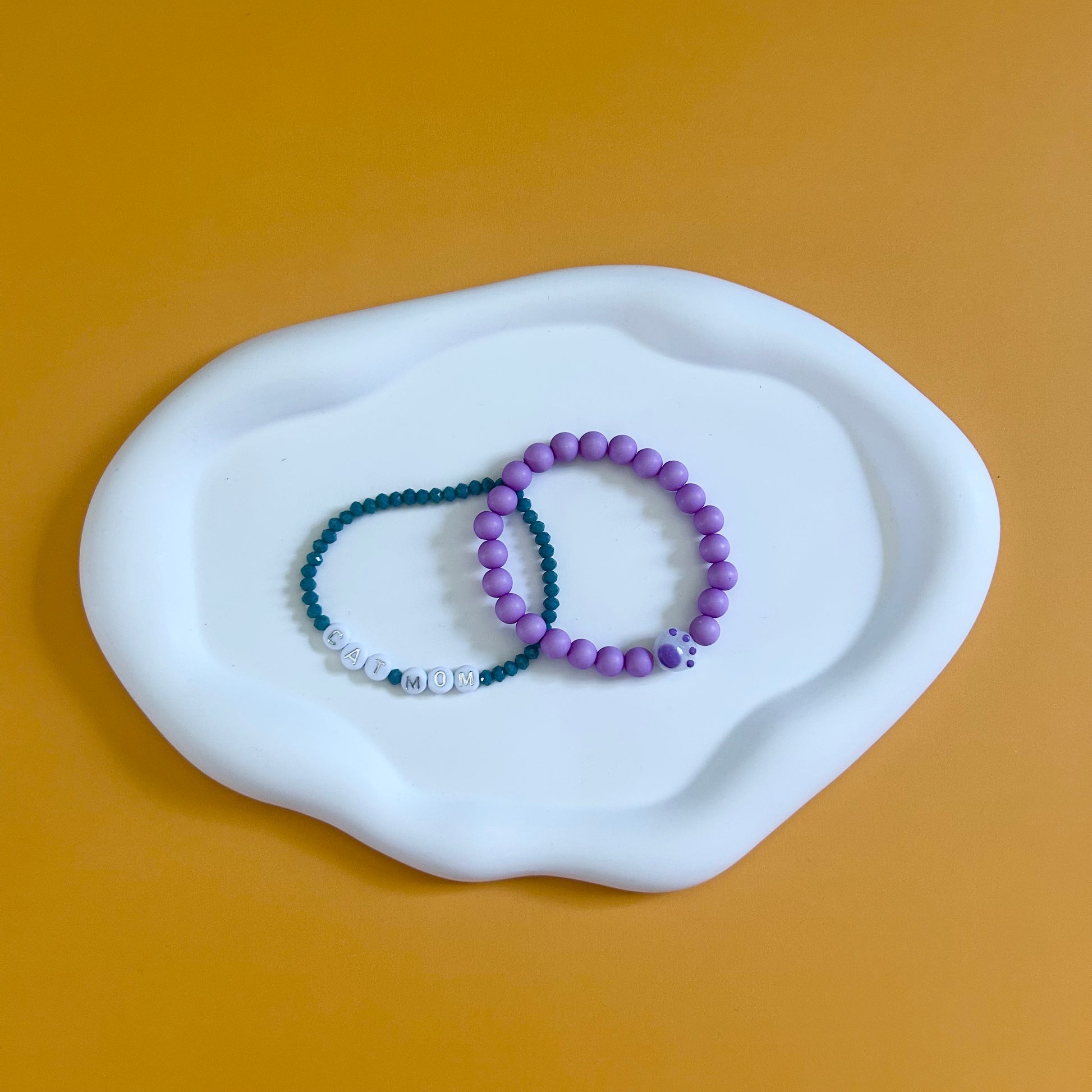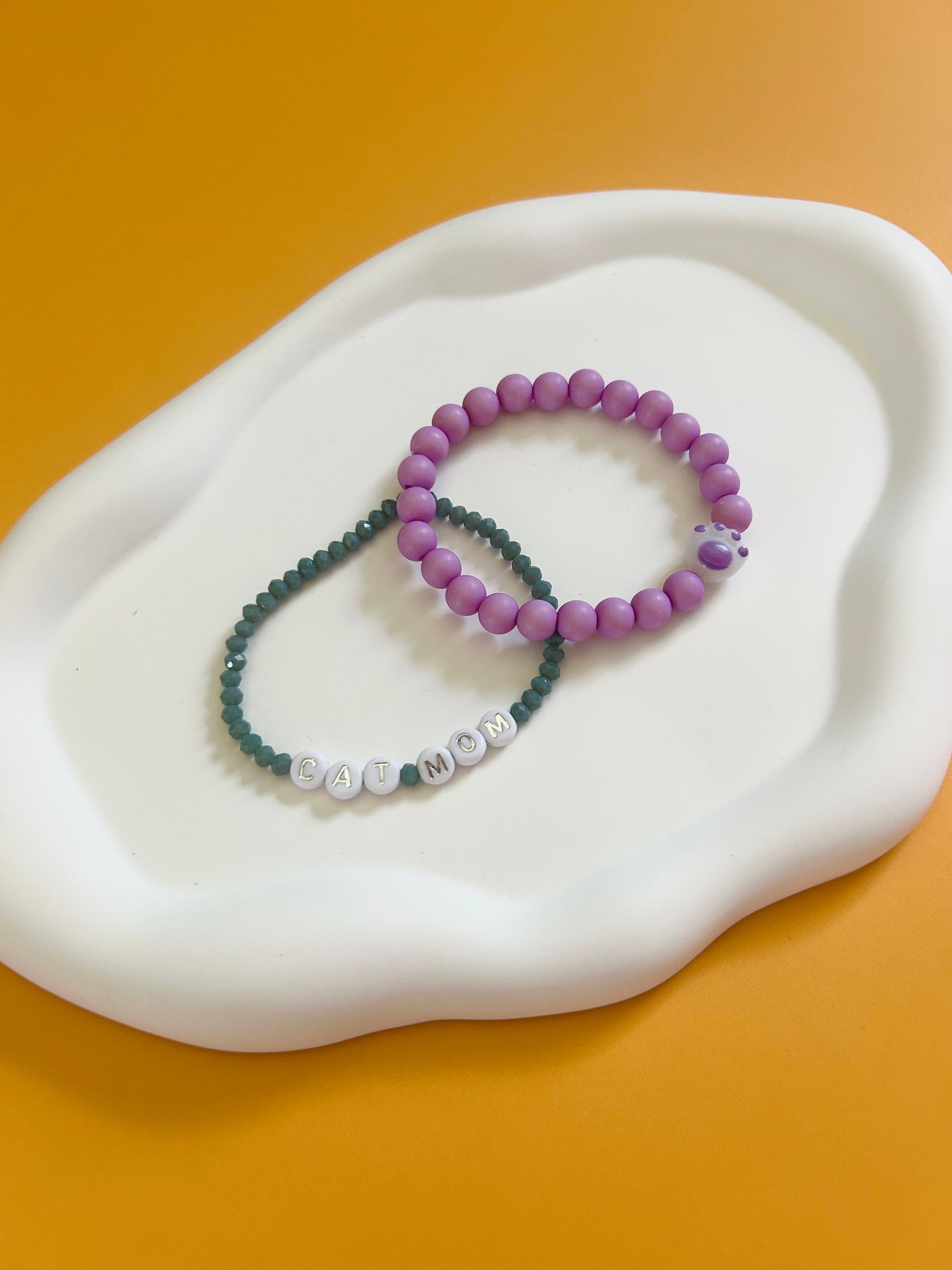 Celebrate your love for your feline friend with this playful Cat Mom Stack! Featuring two bracelets—one sleek gray and one vibrant purple adorned with a charming paw print bead—this set adds a fun and stylish touch to any outfit. Perfect for showing off your cat mom pride with a pop of color and personality.