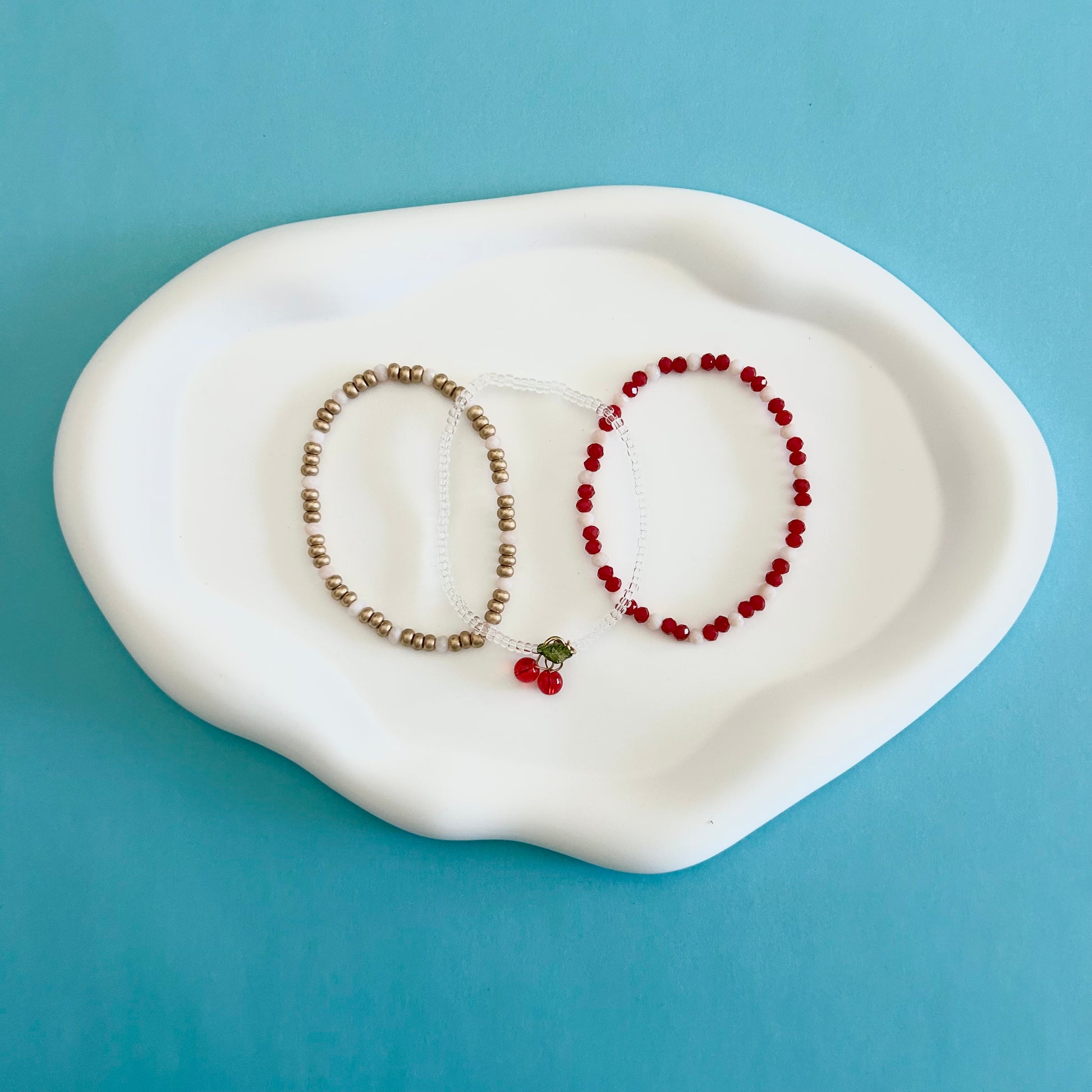 Add a pop of fun to your look with this playful 3-stack bracelet set featuring gold, white, and red bands. Accented with a charming cherry charm, perfect for adding a sweet and vibrant touch to any outfit. Mix and match or wear them all together for a cheerful, stylish statement.