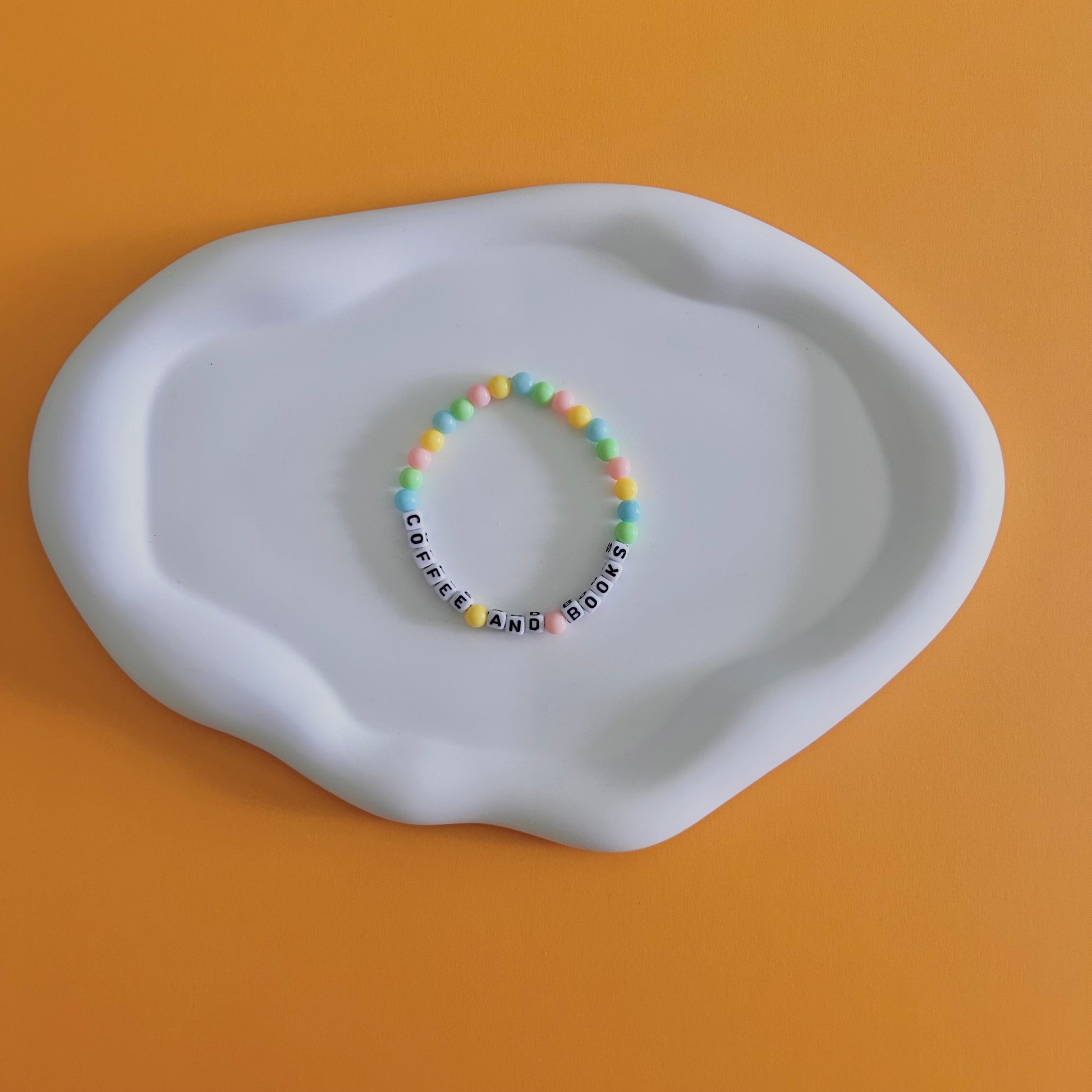 Add a splash of charm to your wrist with this pastel-colored bracelet featuring the playful words "coffee and books." Perfect for cozy mornings and literary adventures, it’s a fun accessory that celebrates your favorite comforts in style.