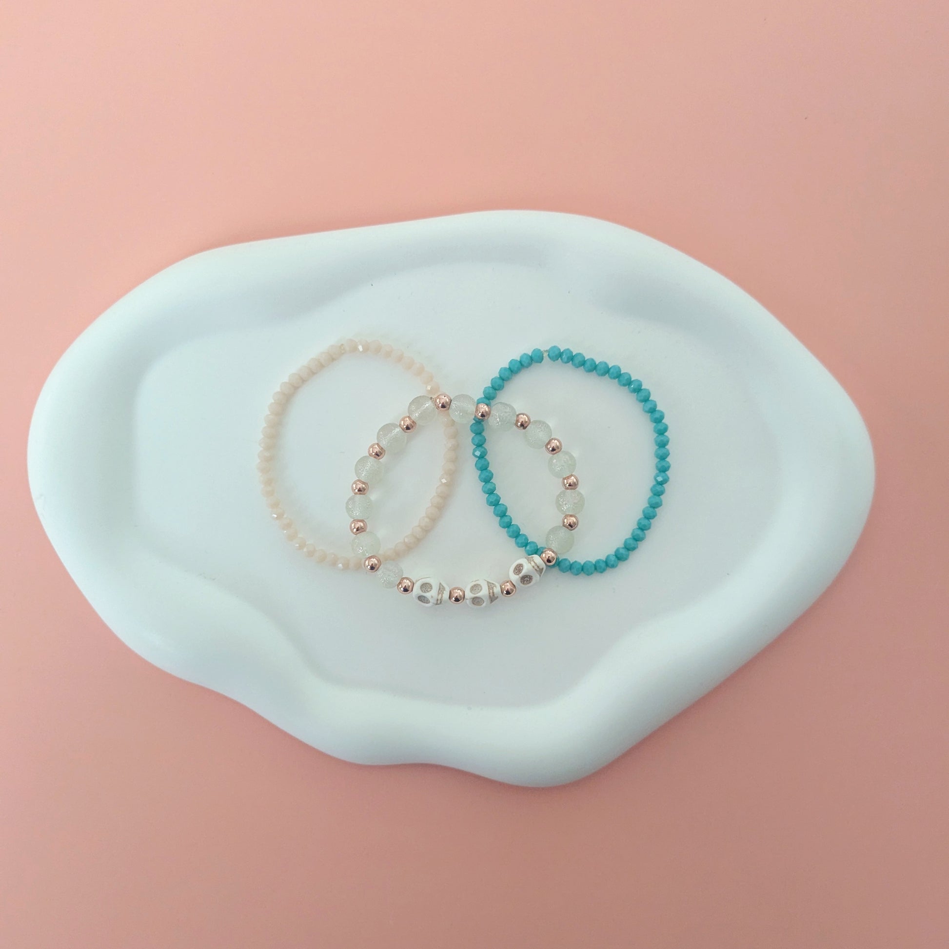 Enhance your Halloween look with our Cream Skull Bracelet Stack. The sleek skulls and neutral colors create a statement piece for your wrist. Meticulously crafted, this stack will add a spooky touch to any outfit.