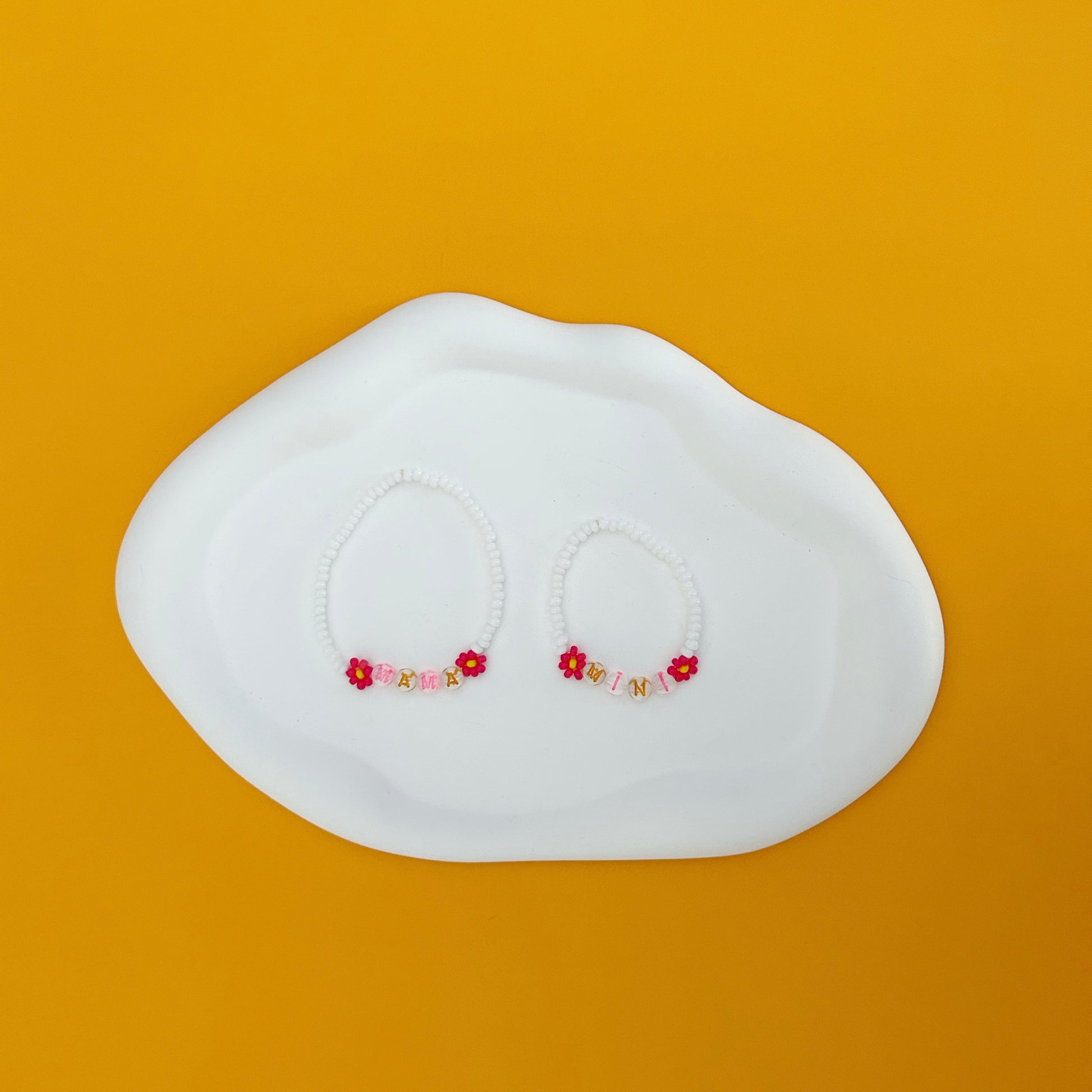 Celebrate the special bond with these playful matching bracelets featuring two charming pink daisies. One bracelet proudly says "Mama," and the other "Mini," making them the perfect pair to share love and style between mother and child. Bright, fun, and full of heart!