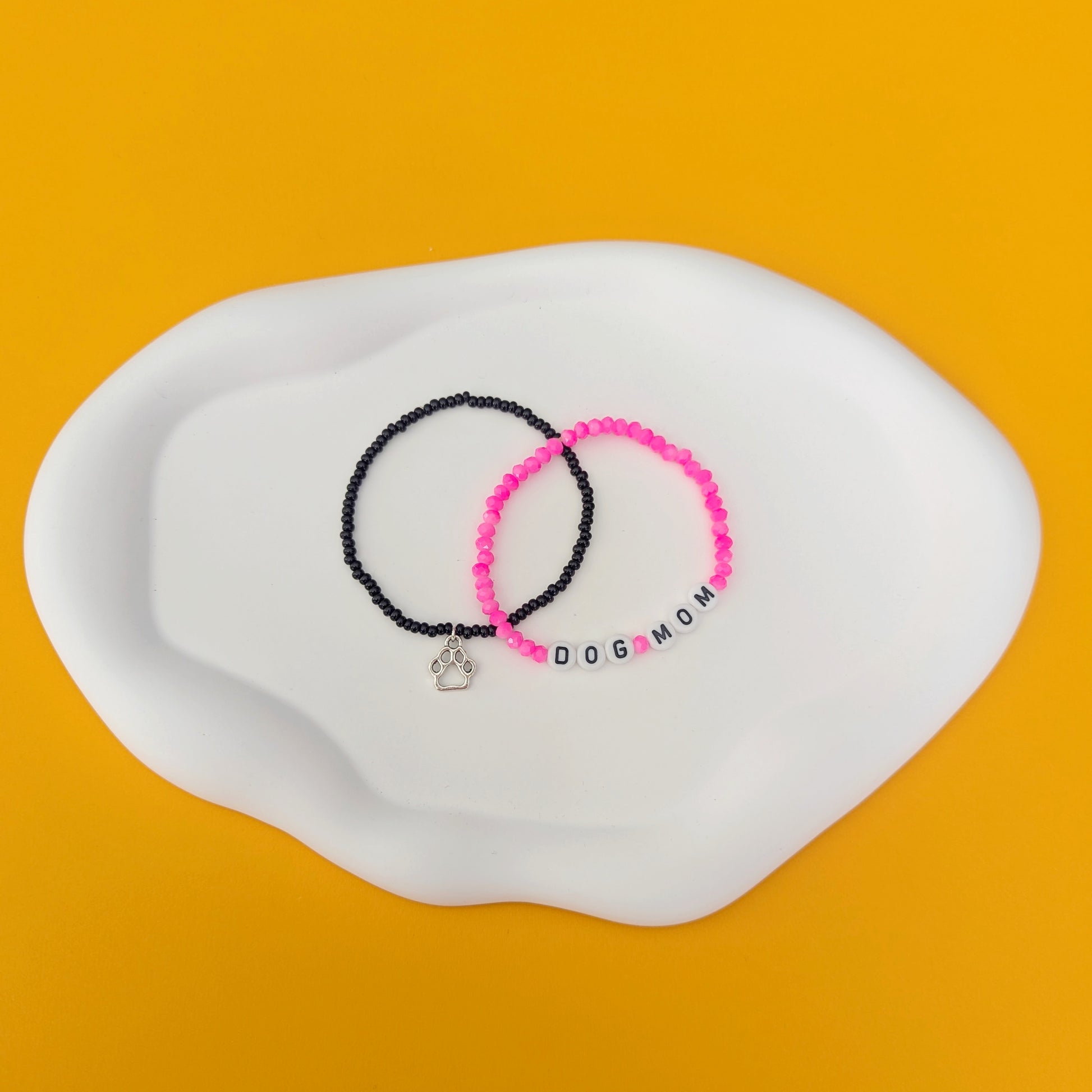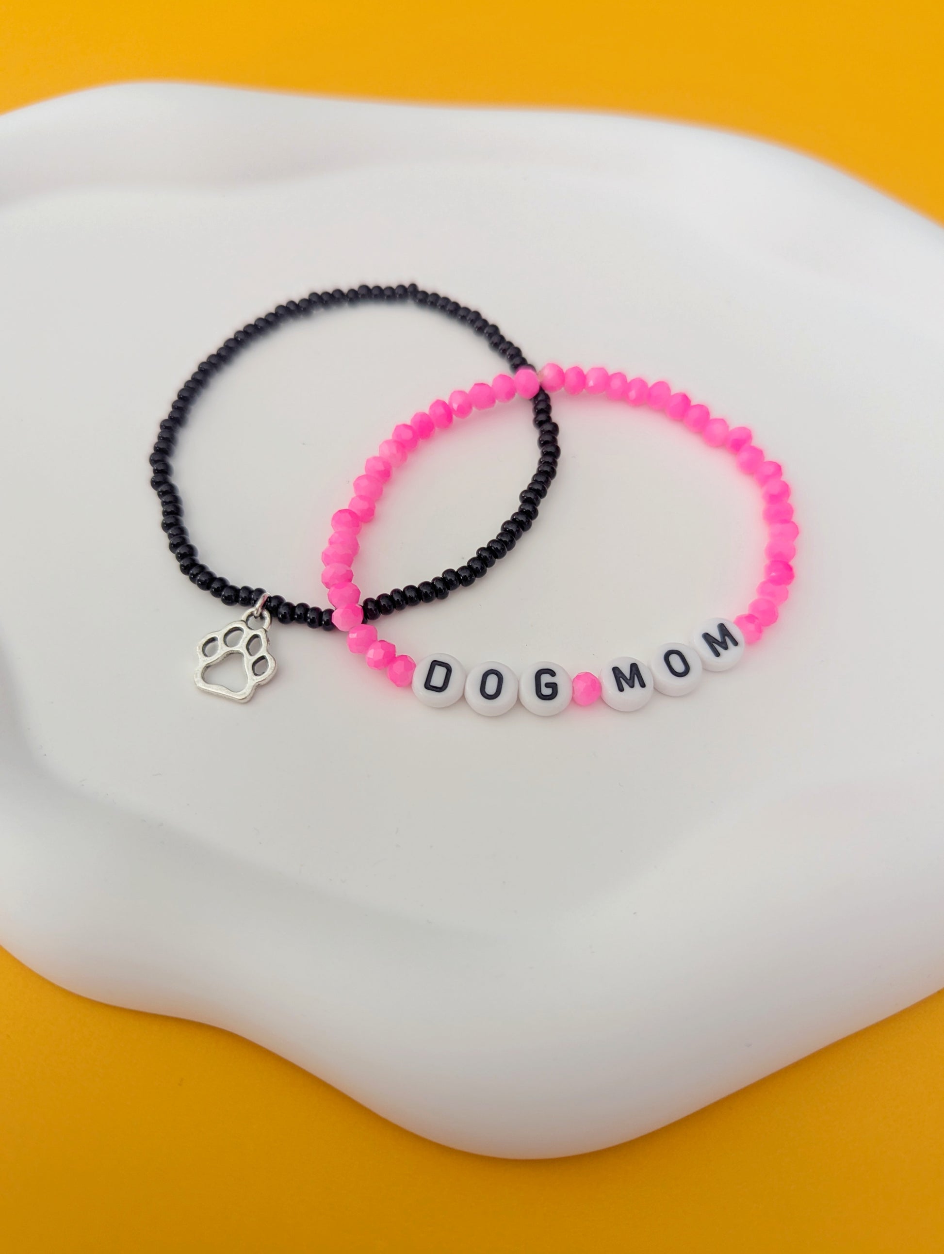 Show off your love for dogs with the Dog Mom Stack! This playful bracelet stack includes a mix of pink and black designs, perfect for any dog mom. Share your fun and loving personality with this unique accessory. A must-have for all dog lovers!