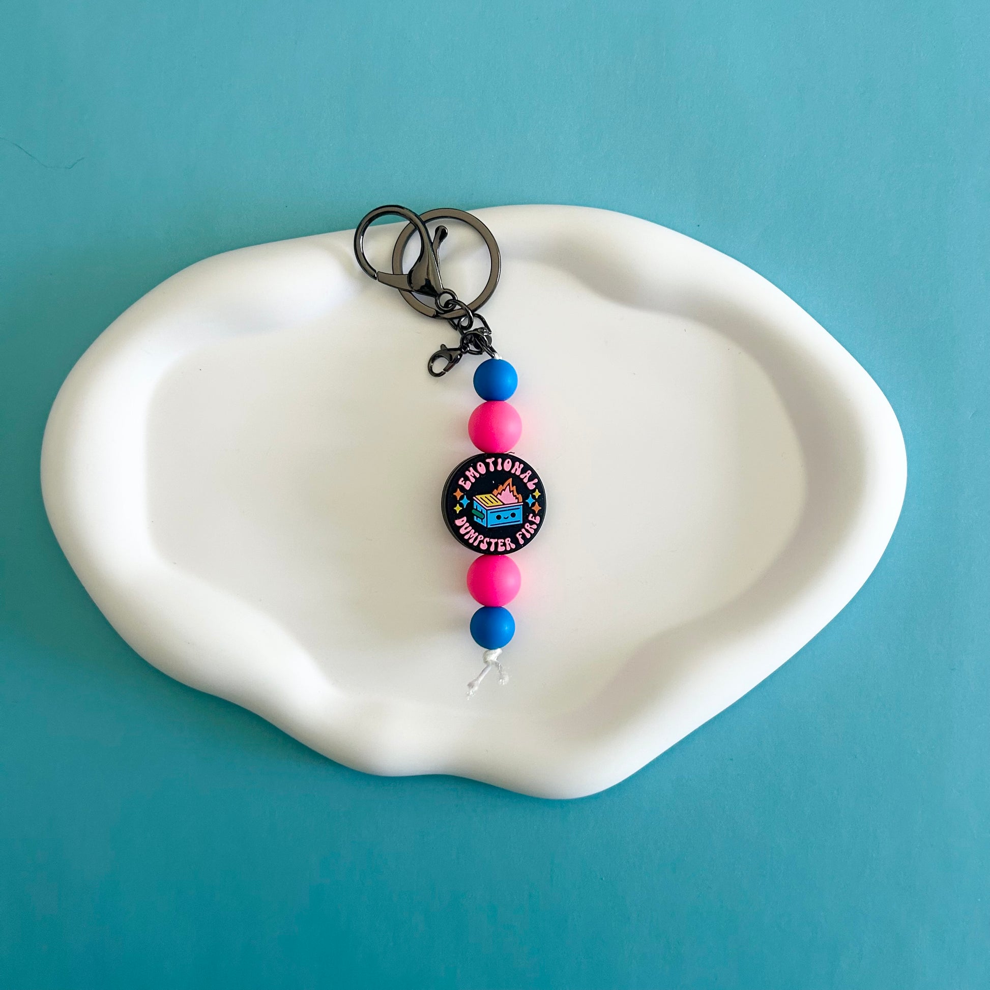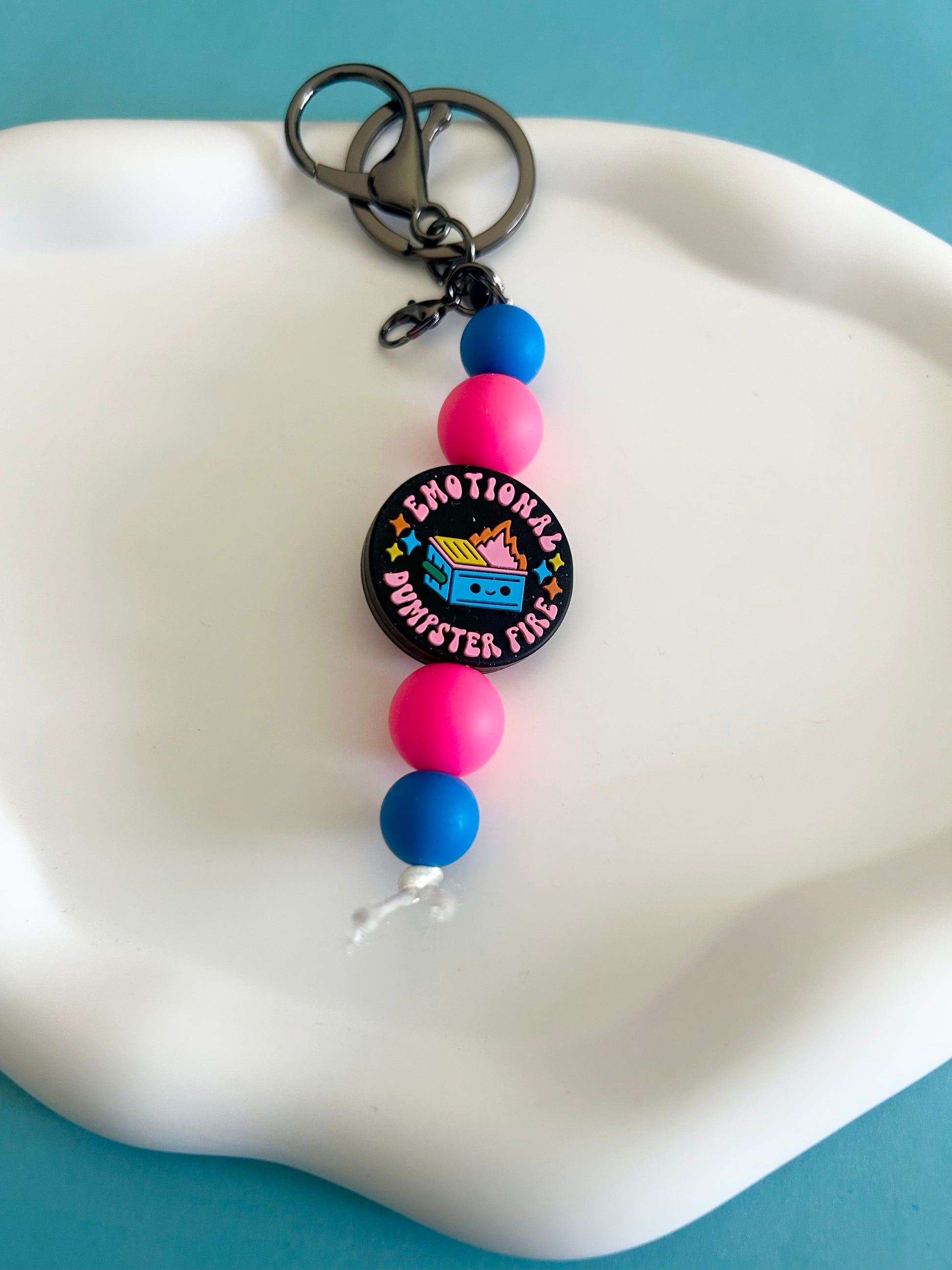 Add a splash of humor to your keys with this playful pink and blue keychain featuring a fiery dumpster labeled "Emotional Dumpster Fire." It's the perfect quirky accessory to express those chaotic feelings with a wink and keep your essentials close in style.