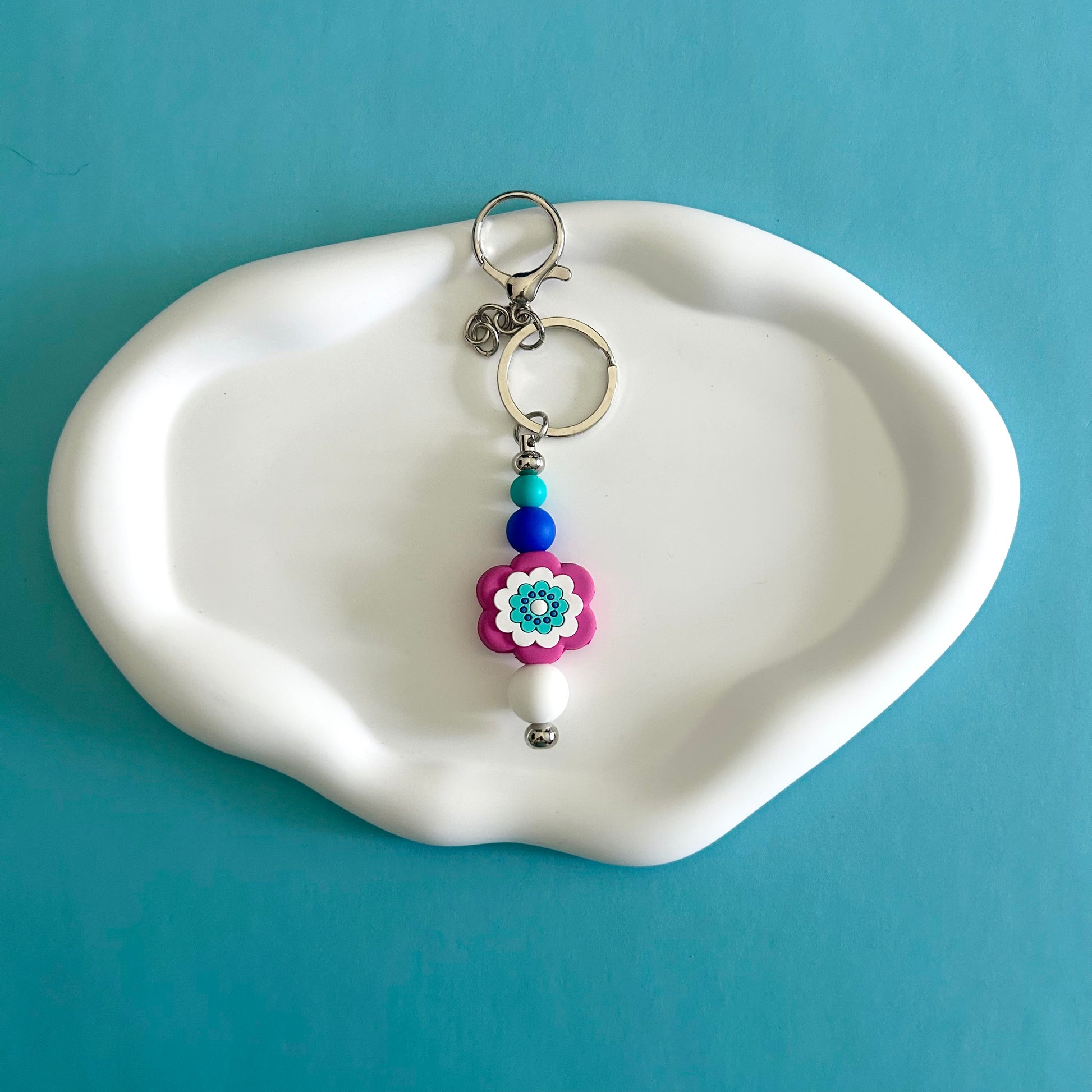 Add a splash of fun to your keys with this bright-colored keychain featuring a big, cheerful flower at its center. Its vibrant hues and playful design make it easy to spot your keys while adding a touch of whimsy to your everyday essentials. Perfect for brightening up your bag or keeping your keys stylishly organized.