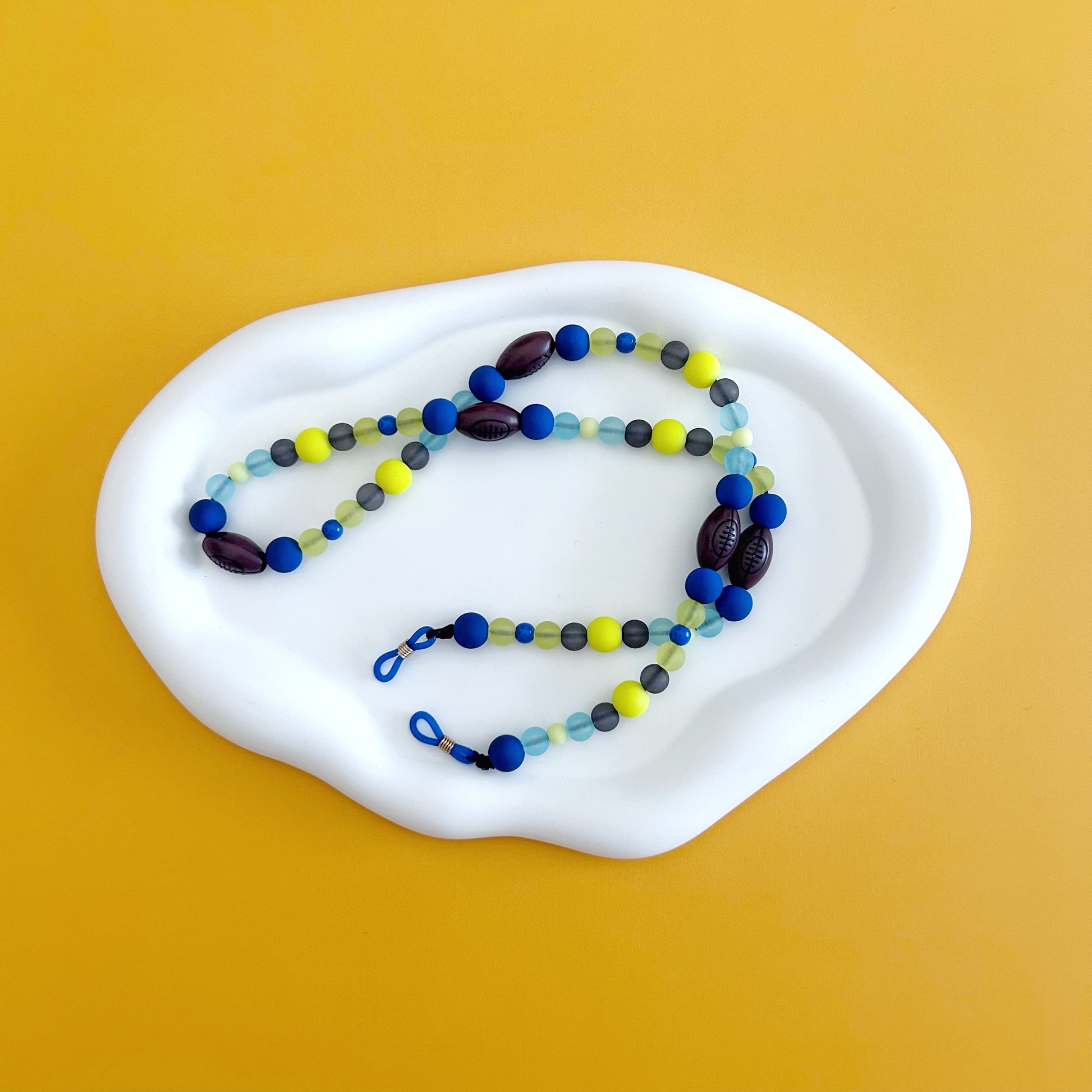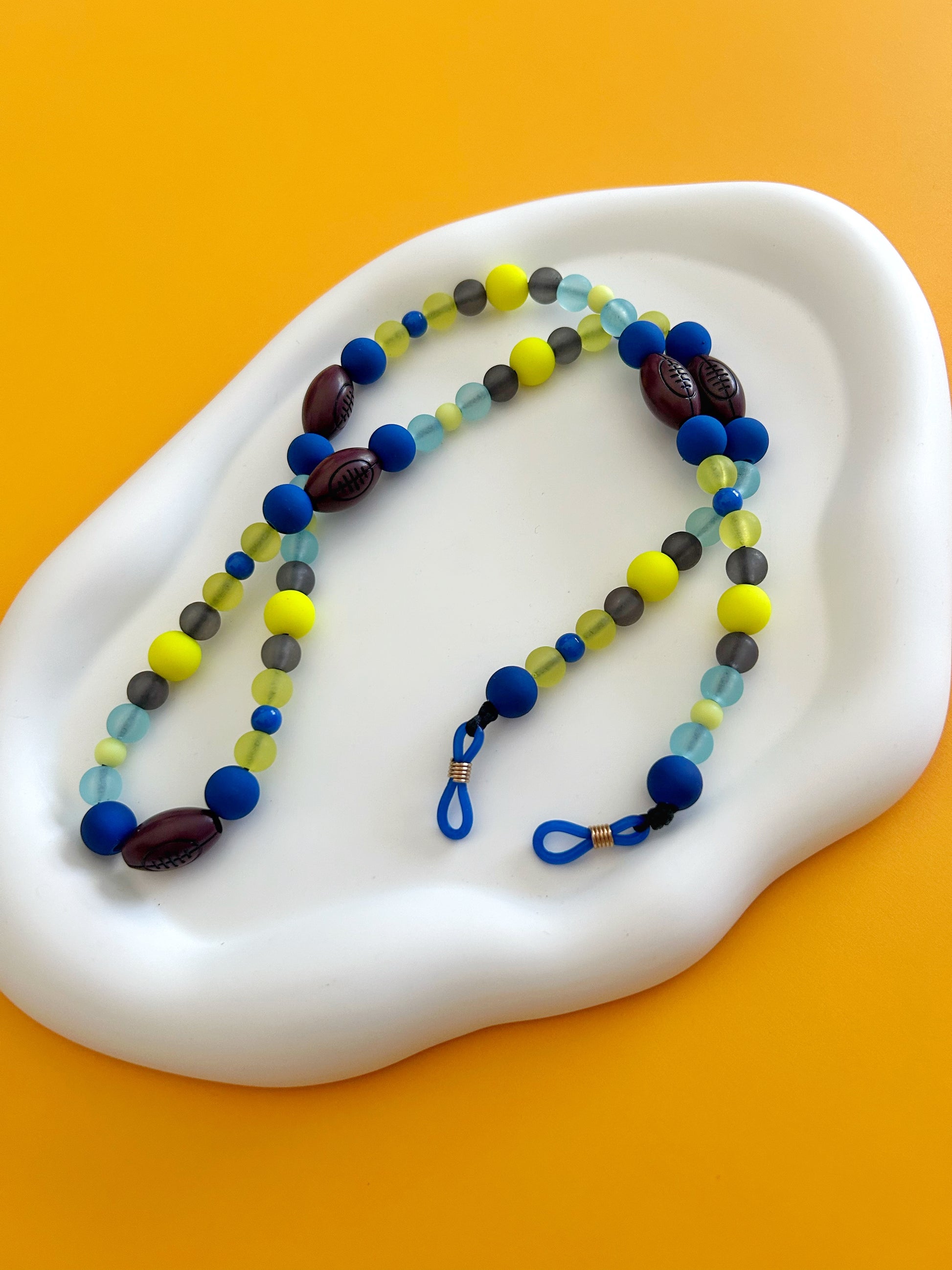 Keep your little athlete’s sunglasses secure and stylish with this playful Football Sunglass Strap. Featuring bright yellow and blue football-shaped beads, it adds a fun pop of color while preventing lost shades during active play. Perfect for kids who love sports and adventure!
