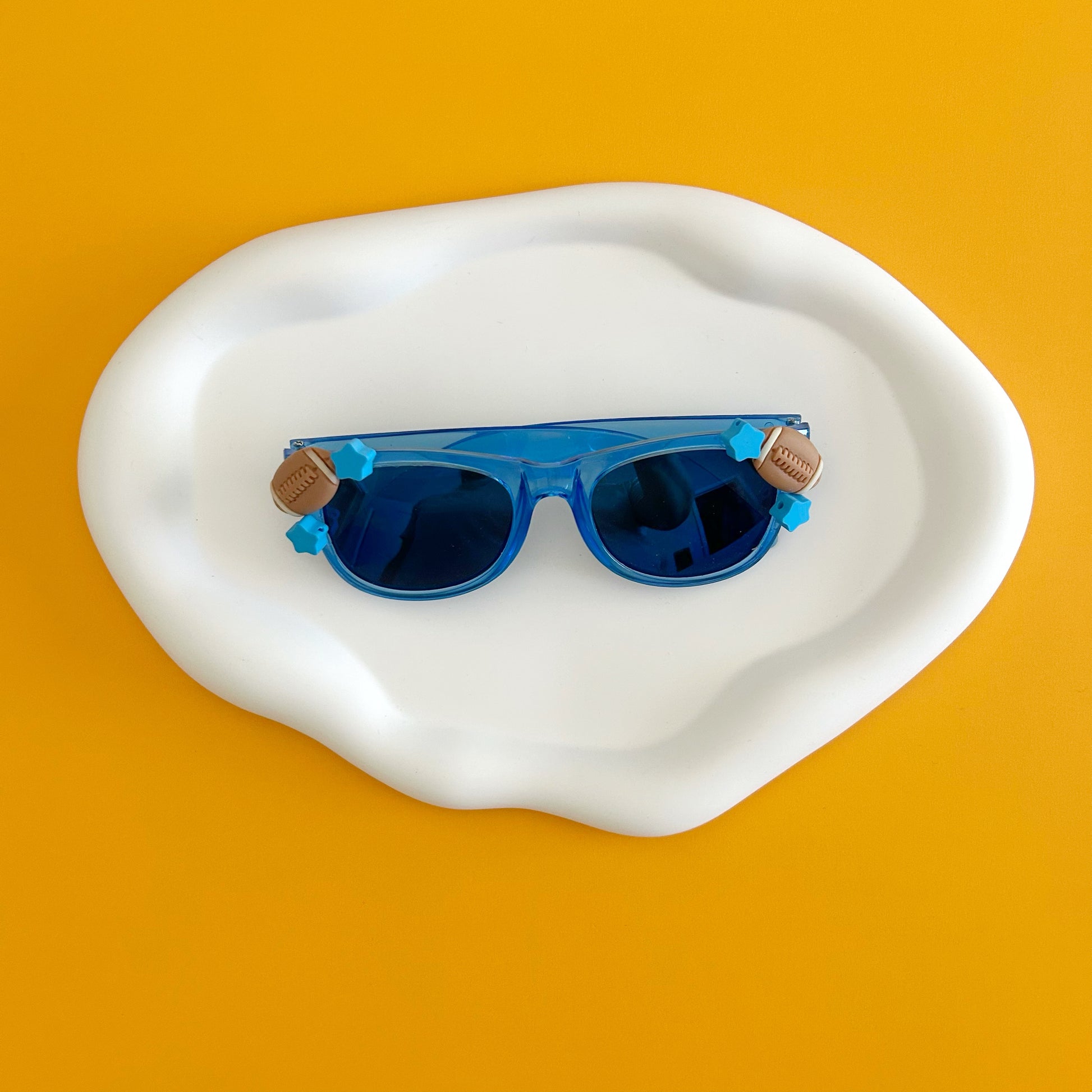 These playful blue kids sunglasses feature fun football-shaped beads along the rim, adding a sporty touch to sun protection. Perfect for little fans, they combine style and eye safety for outdoor adventures.