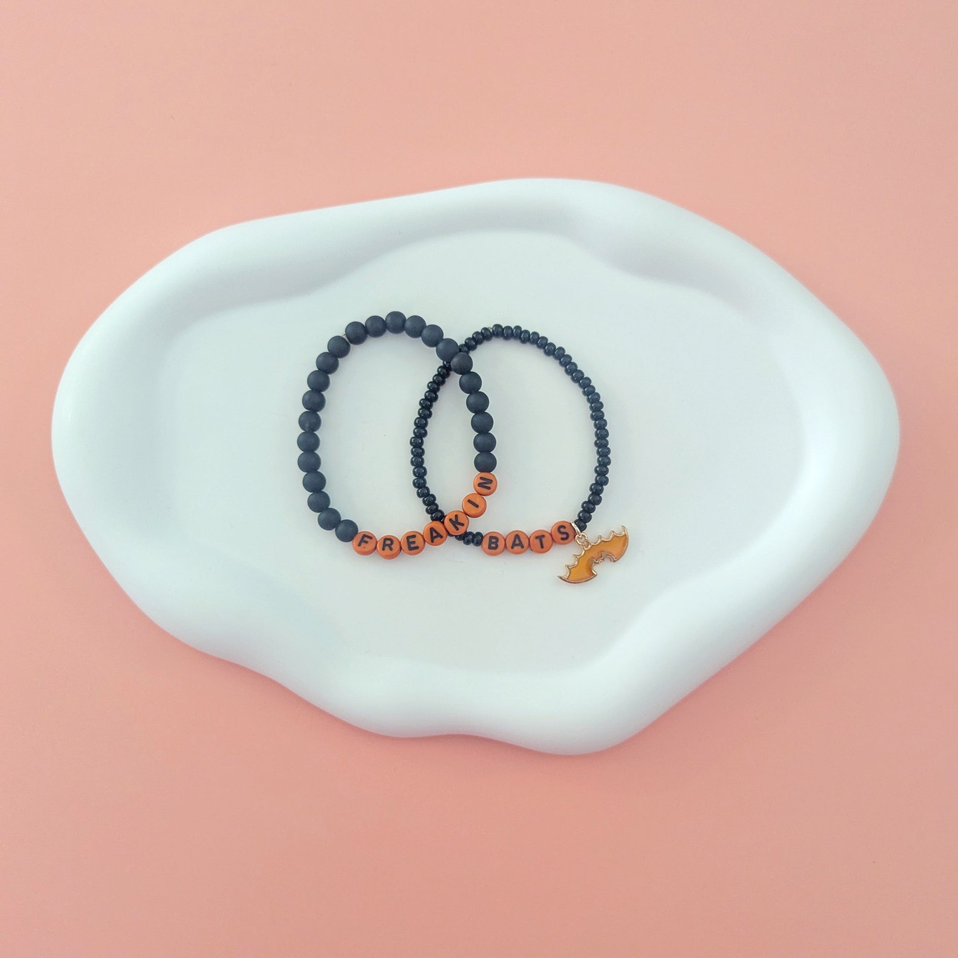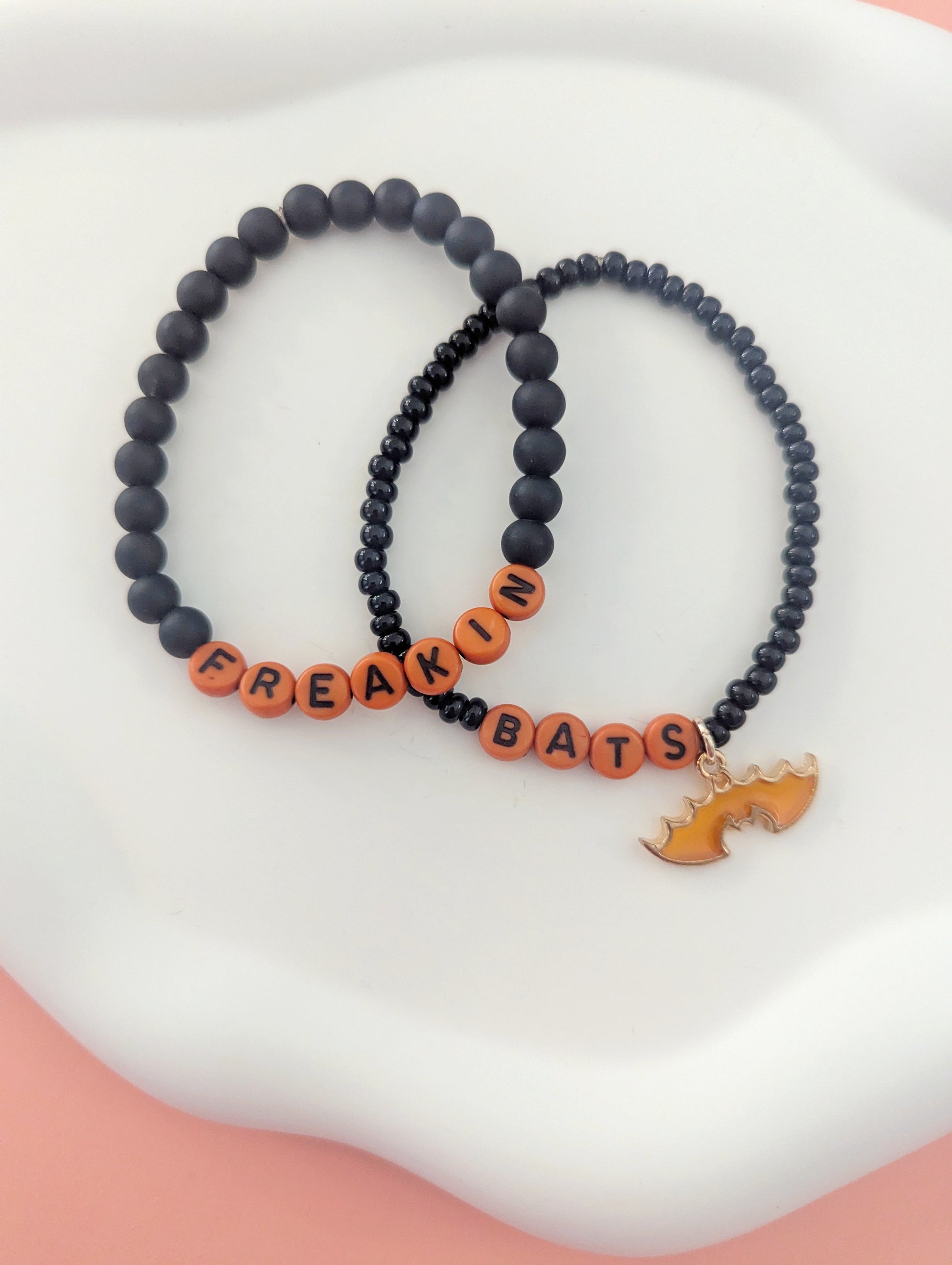 Introducing the Freakin' Bats Stack - perfect for any bat enthusiast! Made with bold black and orange colors, this stack features a unique bat charm that adds a spooky touch. Show off your love for bats with this one-of-a-kind accessory.