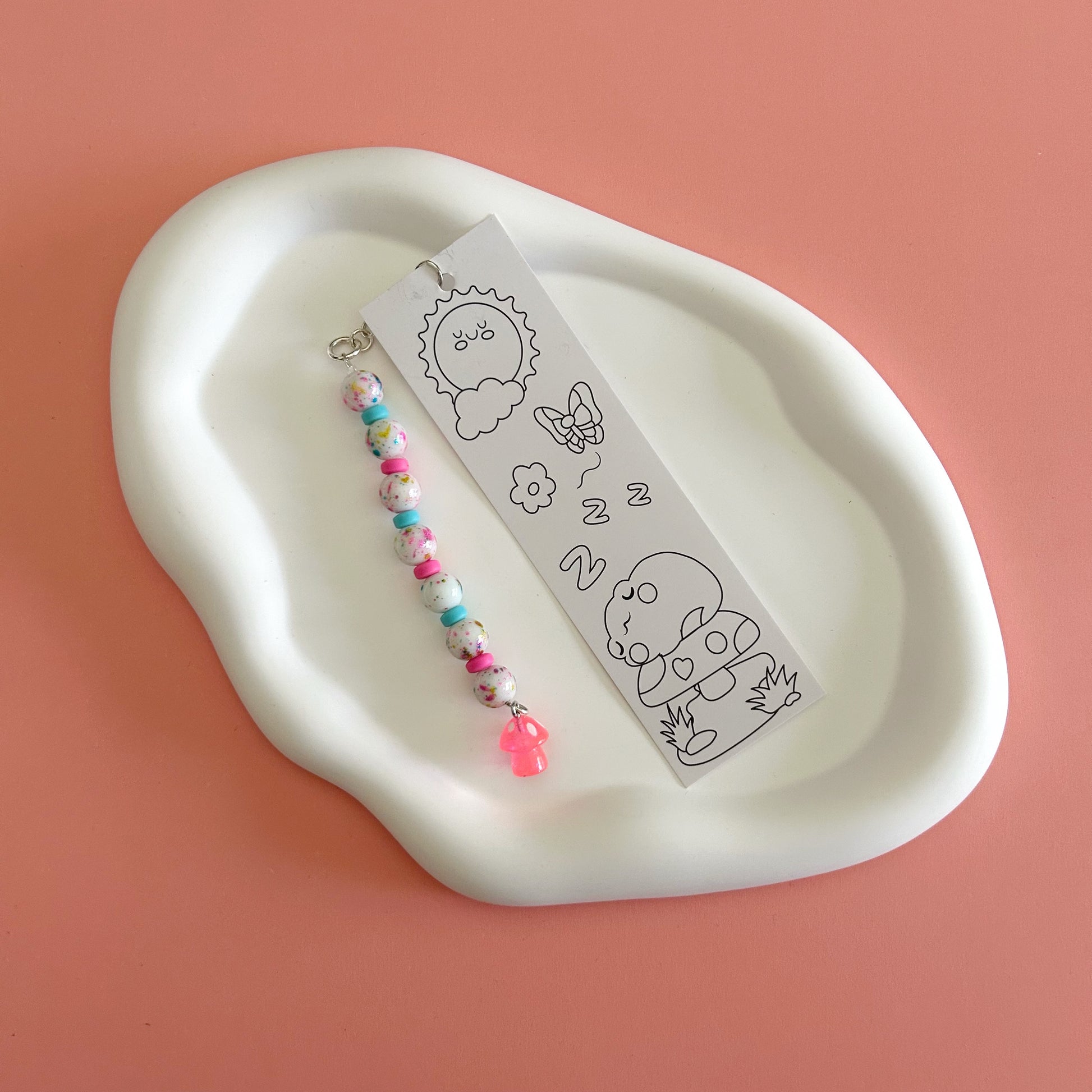 Add a splash of fun to reading time with this playful Frog Bookmark! Featuring a cute frog snoozing on a mushroom, kids can color the design themselves for a personalized touch. Colorful beads and a charming mushroom charm dangle from the end, making it both a delightful and practical accessory to keep your place in any book. Perfect for young readers who love creativity and whimsy!