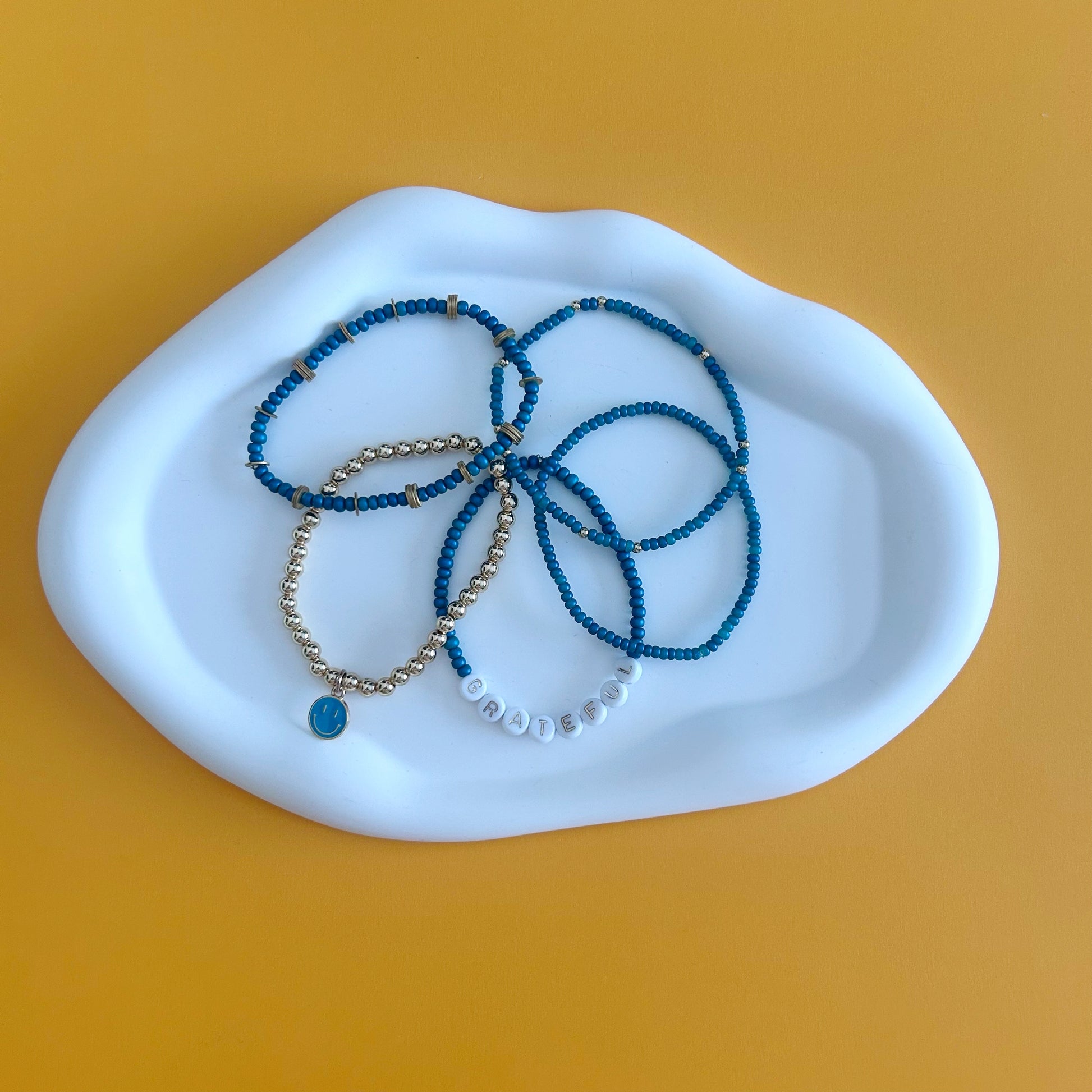 Be grateful for style and positive vibes with our Grateful Stack bracelet set. This blue and gold fall stack features a charming smiley face and the word grateful. Spread good energy and look good doing it. 😊
