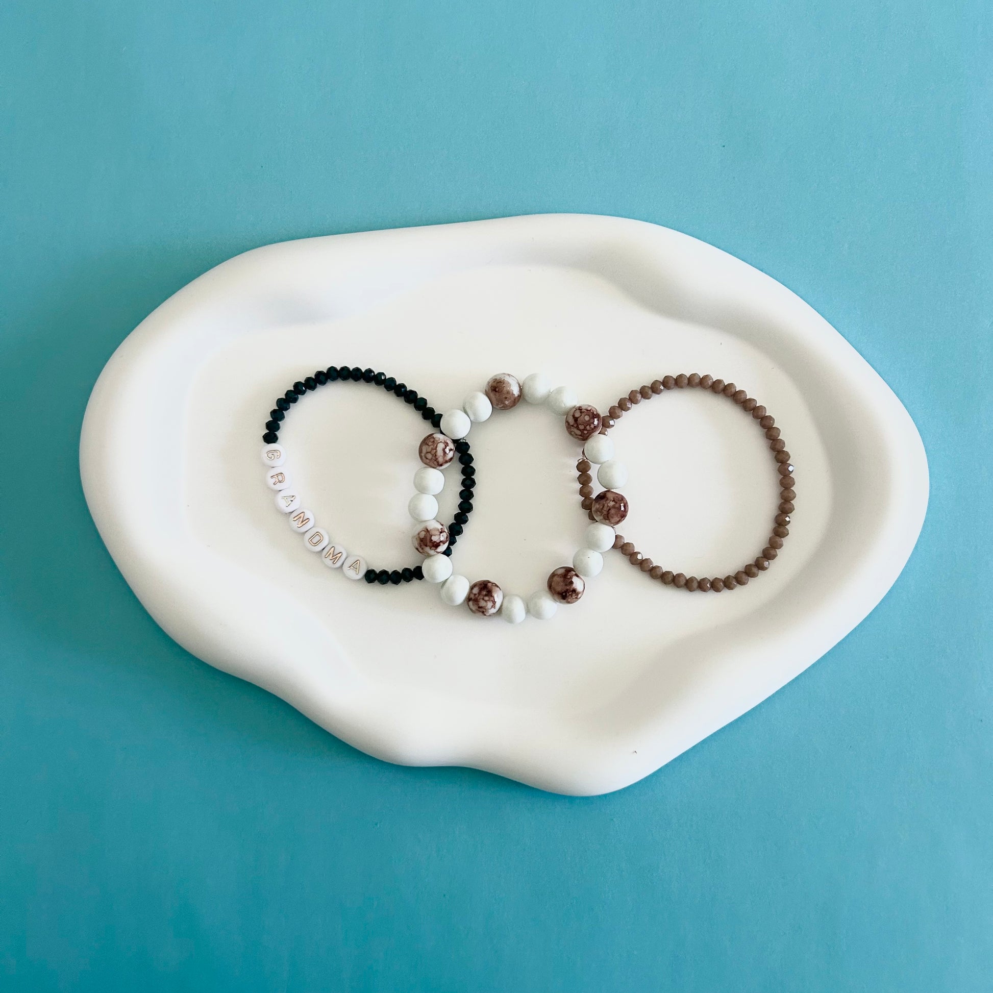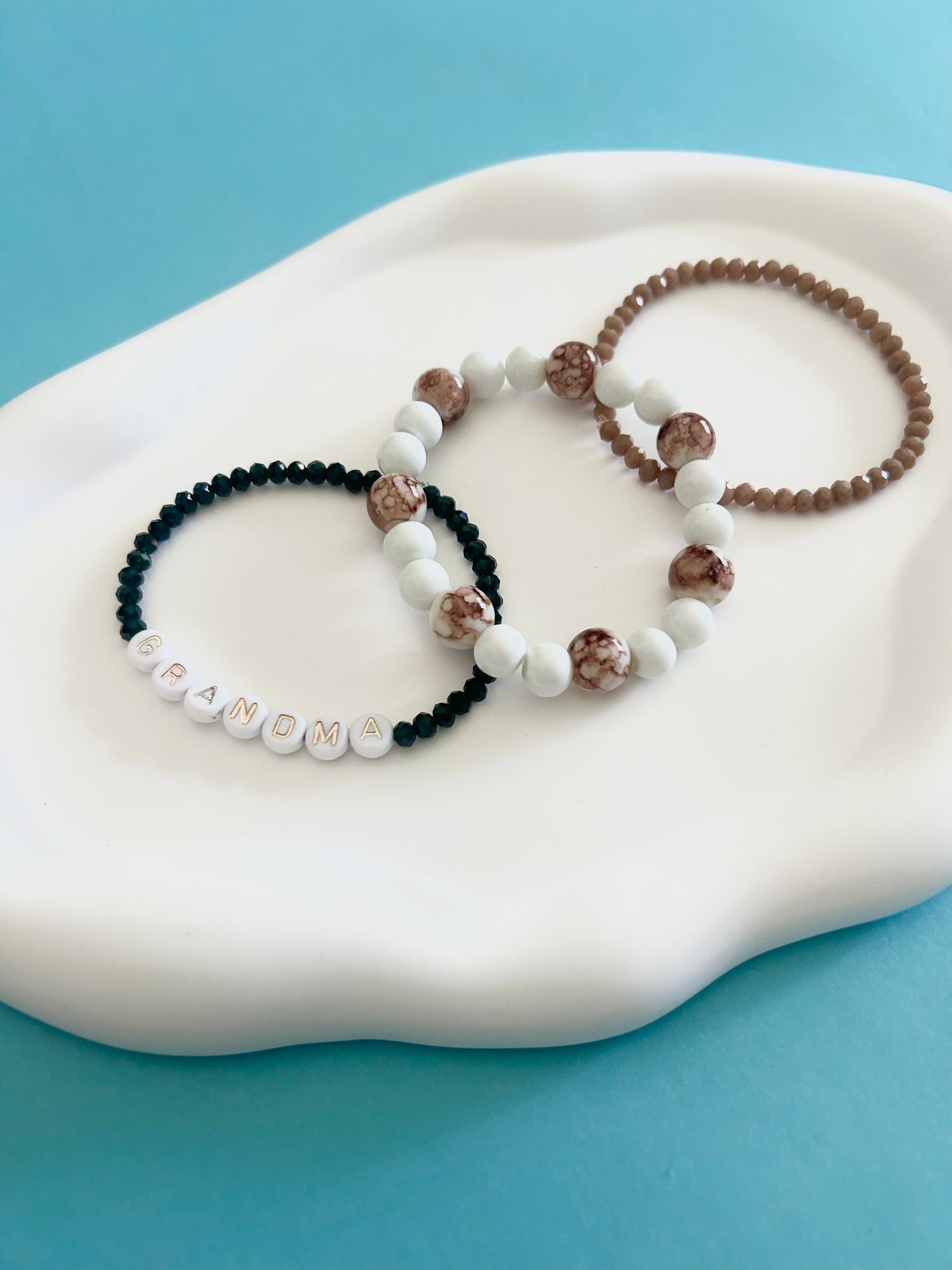 Celebrate grandma’s unique style with this supportive 3-bracelet stack. Featuring one dark green bracelet, one with elegant white and brown marble beads, and one solid brown bracelet, this set offers a harmonious blend of earthy tones. Perfect for everyday wear, it adds a thoughtful touch to any outfit while reminding her of your love and appreciation.