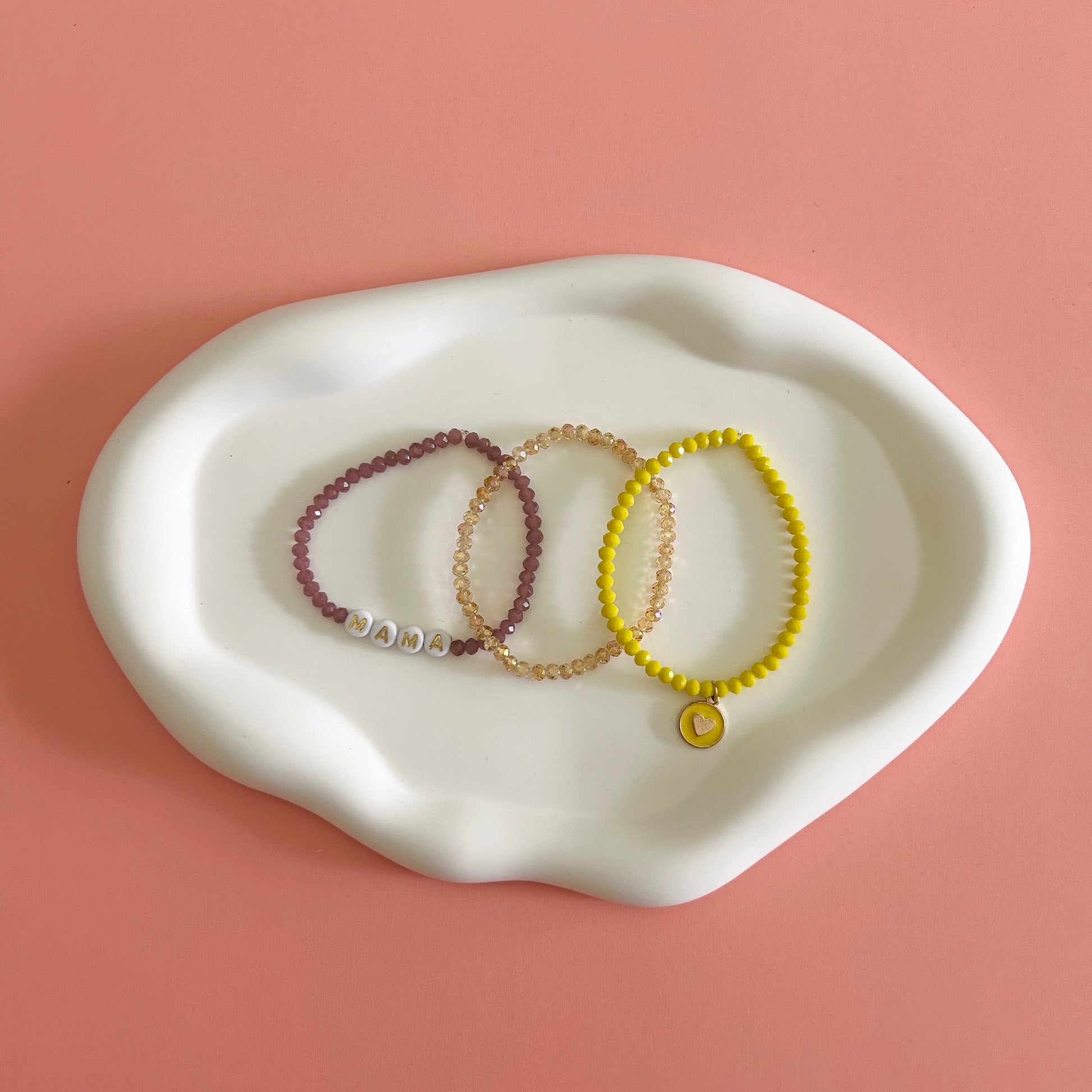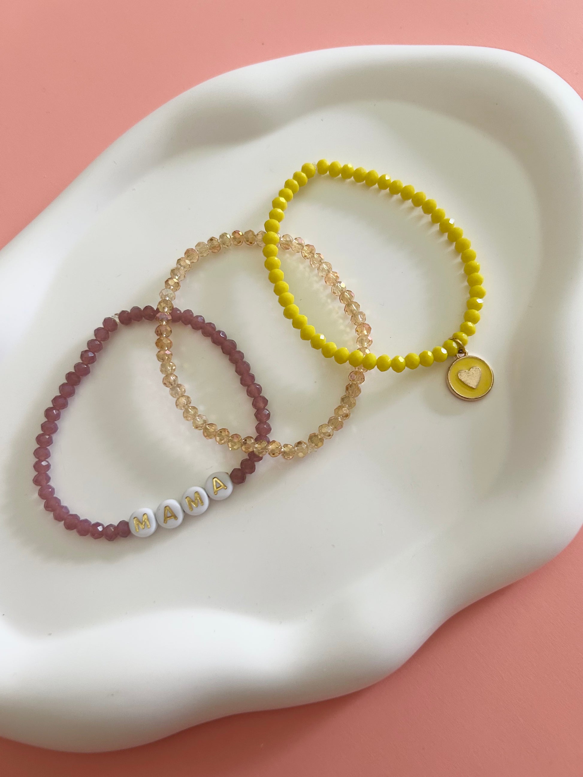 Celebrate the special bond with the Heart Mama Stack, featuring three beautifully coordinated bracelets. This set includes one purple, one golden yellow, and one bright yellow bracelet, with a charming yellow heart accent to symbolize love and warmth. Perfect for moms who appreciate meaningful, colorful accessories that brighten their day and remind them of the love they inspire.