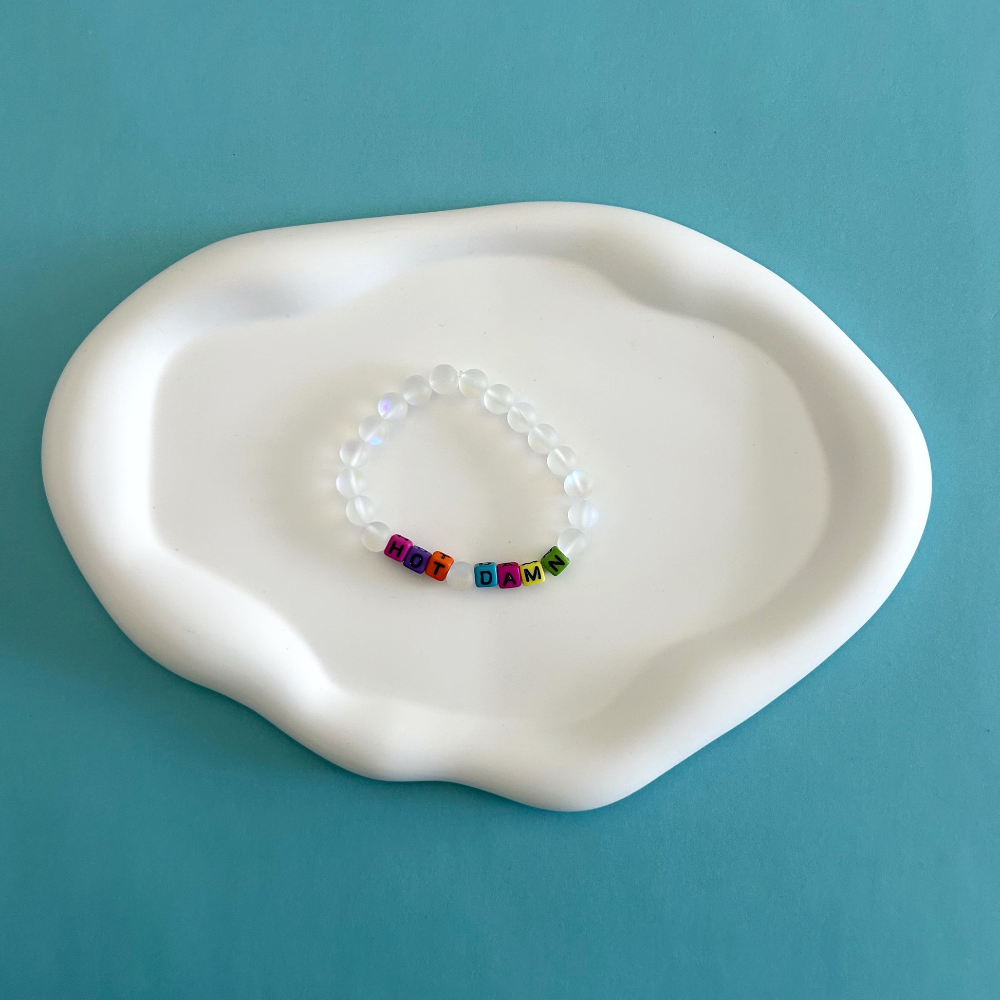 Add a splash of fun to your wrist with this playful white bracelet featuring colorful block letter beads that spell out "hot damn." It's the perfect accessory to brighten your day and show off your bold personality with a cheeky twist.