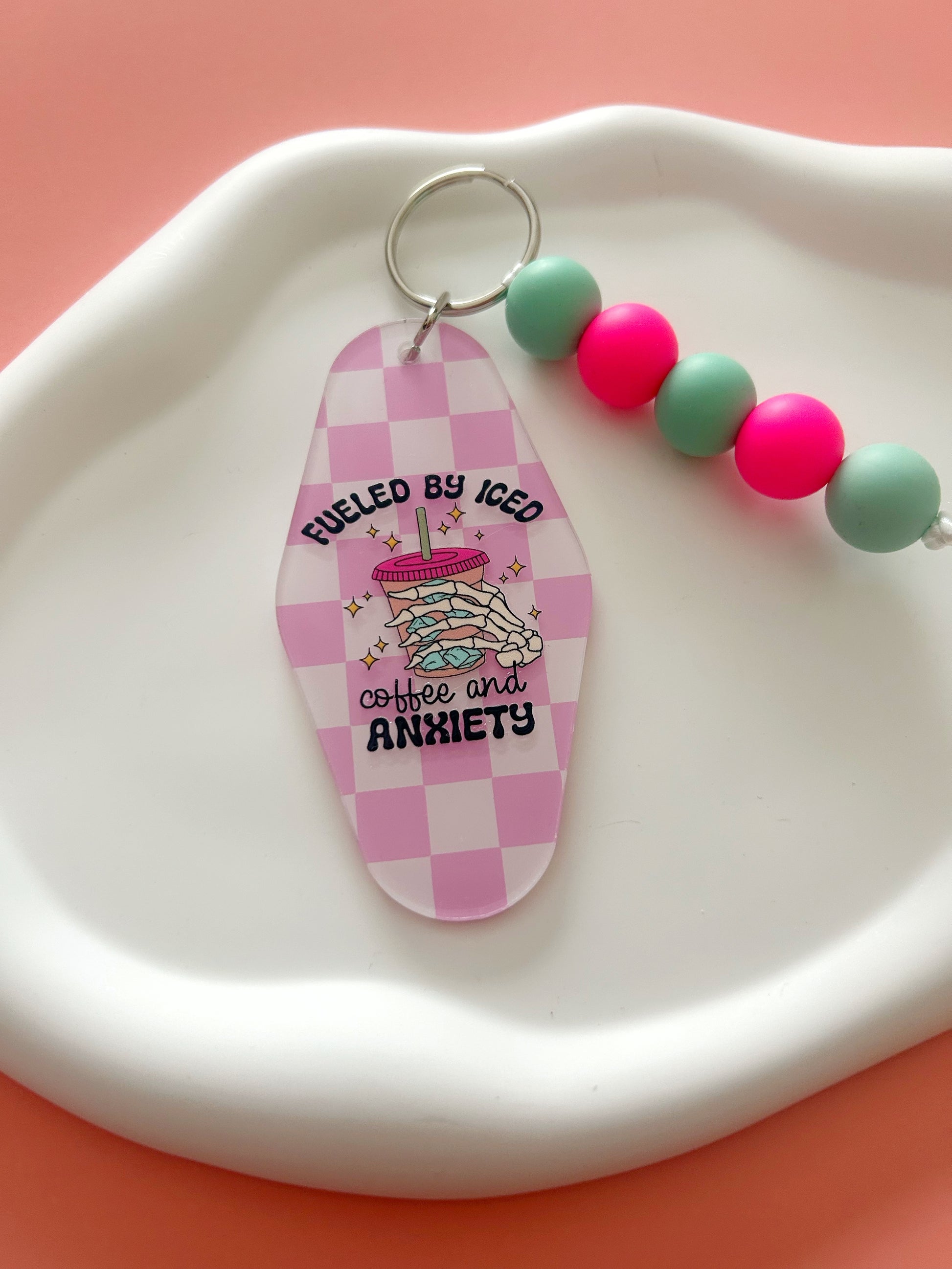 Carry a little humor wherever you go with this playful acrylic keychain that reads "Fueled by Iced Coffee and Anxiety." It's a fun, relatable reminder of those busy days powered by caffeine and a touch of nerves—perfect to brighten your keys or bag with a bit of personality. Durable and lightweight, this keychain is ideal for coffee lovers who appreciate a witty twist.