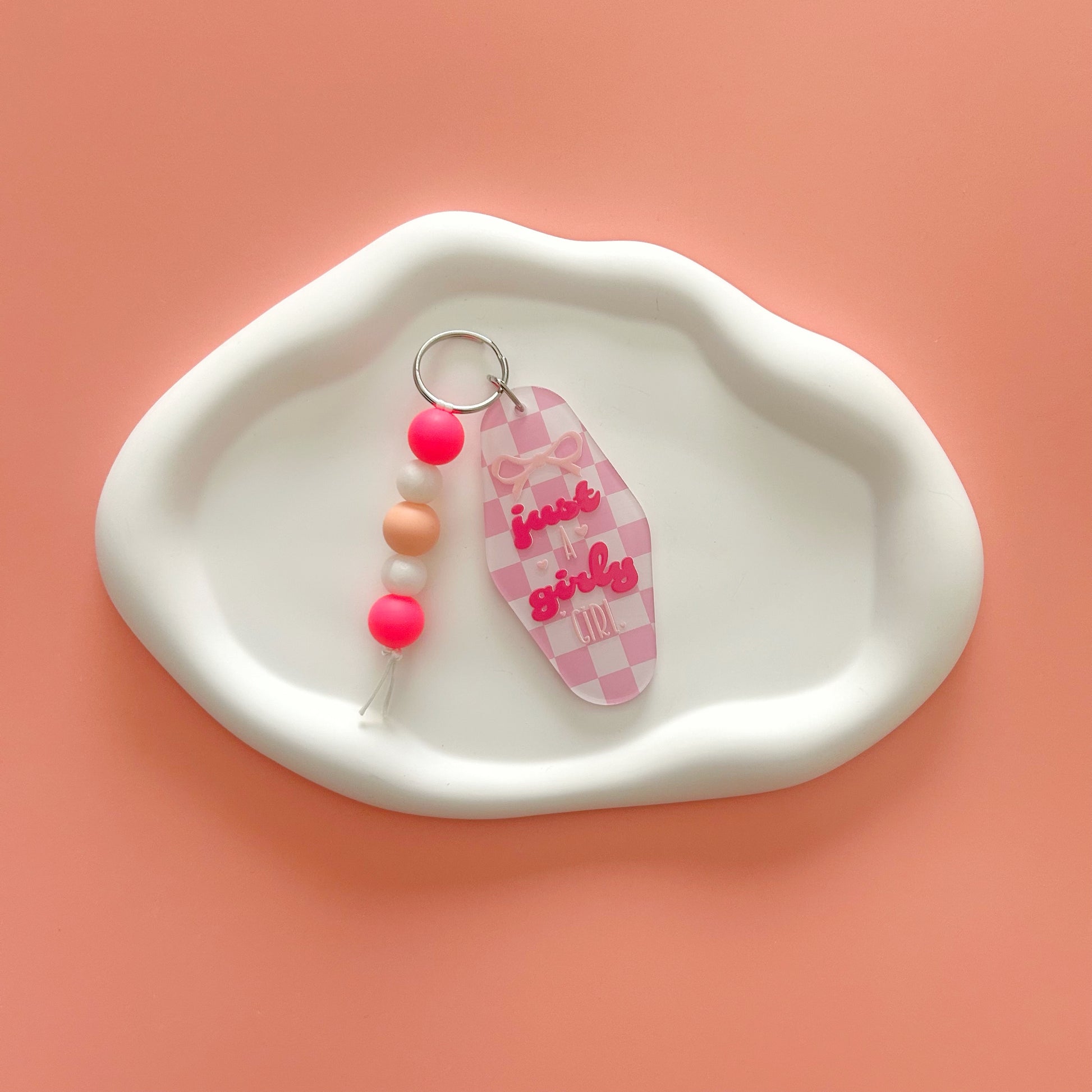 Add a splash of fun to your keys with this playful acrylic keychain! Featuring the phrase "Just A Girly Girl," it's perfect for anyone who loves to show off their feminine side with a touch of charm. Durable and lightweight, this keychain is ideal for keeping your hotel or house keys handy while adding a cute, personal flair.