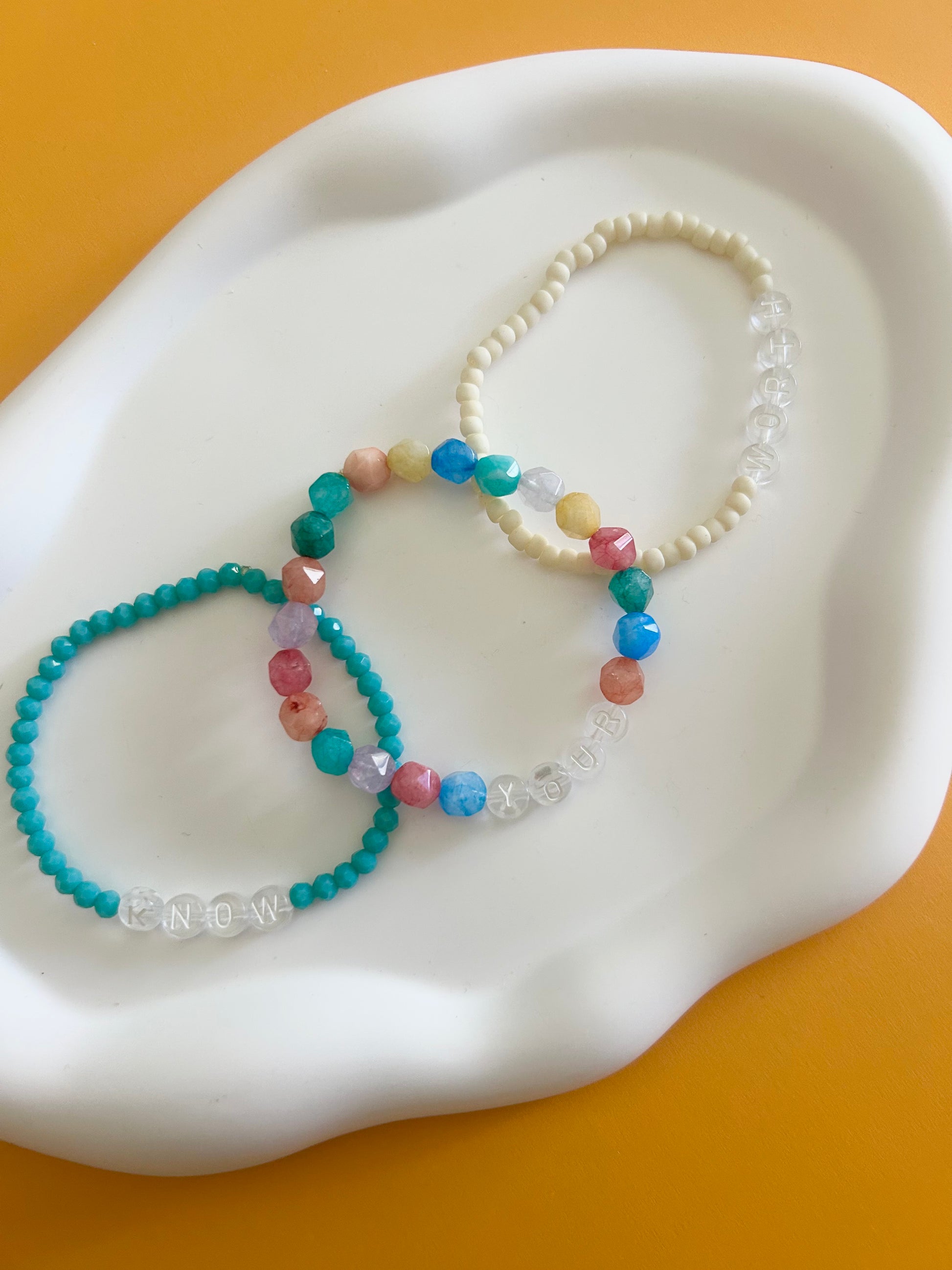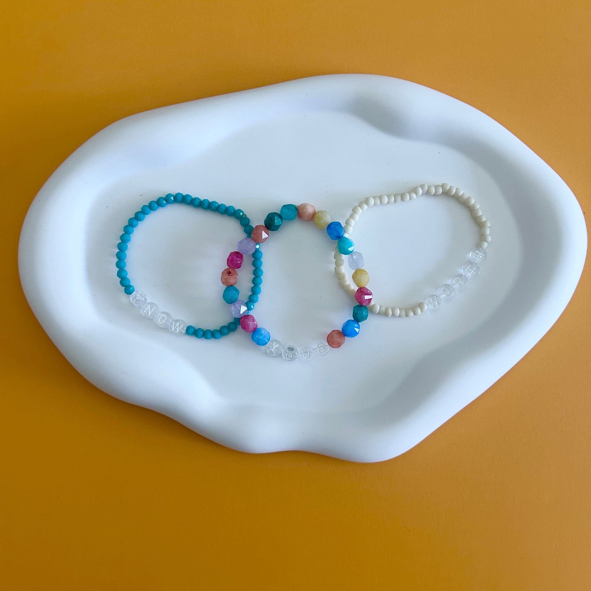 Celebrate your unique style with the Know Your Worth Stack! This playful trio features one vibrant blue bracelet, a lively multicolored one, and a soft cream band, each reminding you to embrace your value every day. Perfect for stacking, these bracelets add a fun pop of color and confidence to any outfit.
