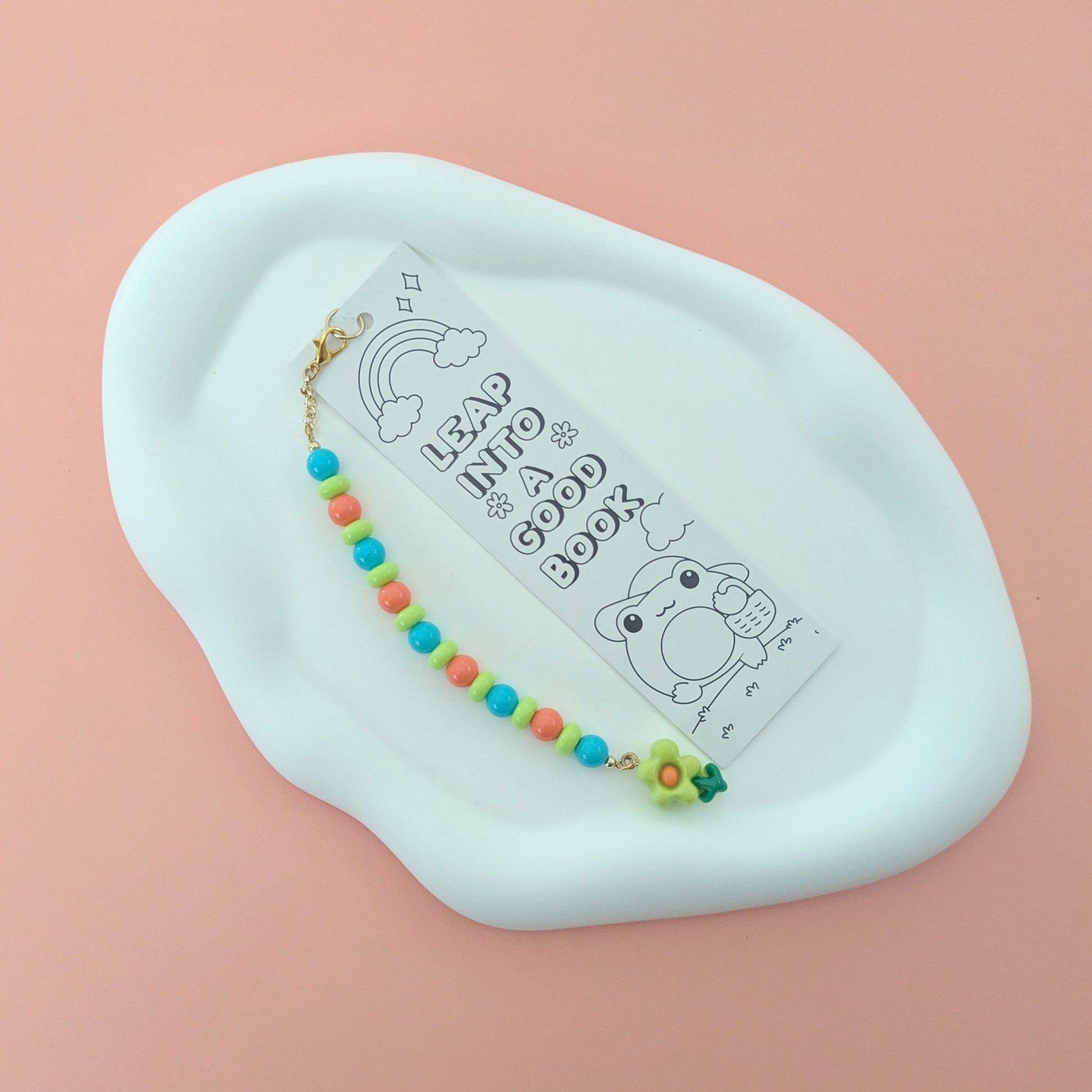 Enhance your reading experience with our Leap Into a Good Book Bookmark! Featuring a cute frog design, this unique bookmark comes with a clip on bead strand and a flower charm. Let your creativity flow by coloring it yourself. The perfect accessory for any book lover!