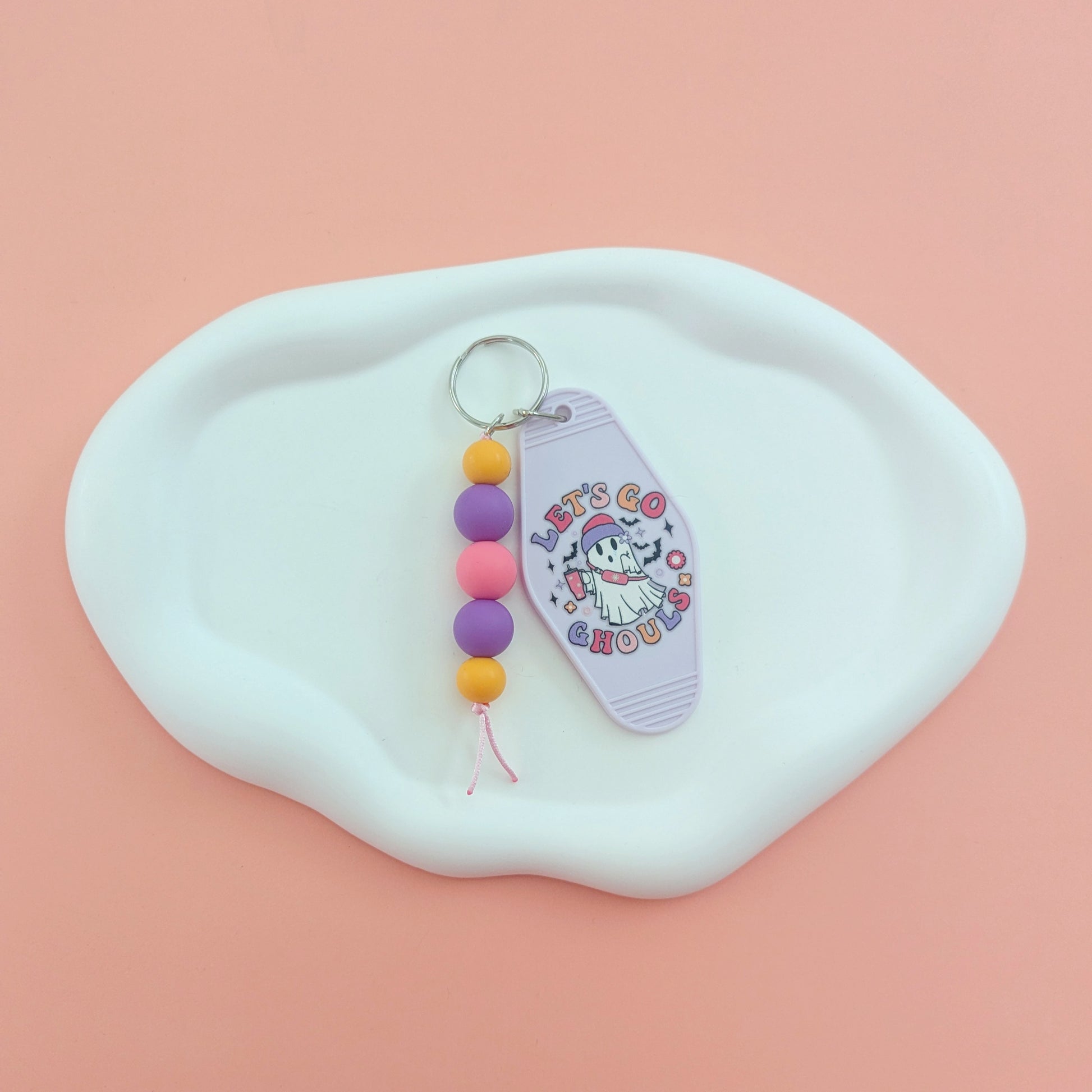 Introducing the Let's Go Ghouls Acrylic Keychain - the must-have accessory for any ghost-loving girl! This girly keychain features a spooky ghost design that is sure to make a statement. Made of high-quality acrylic, it is both durable and lightweight. Complete your look and show off your love for ghosts with this unique keychain.