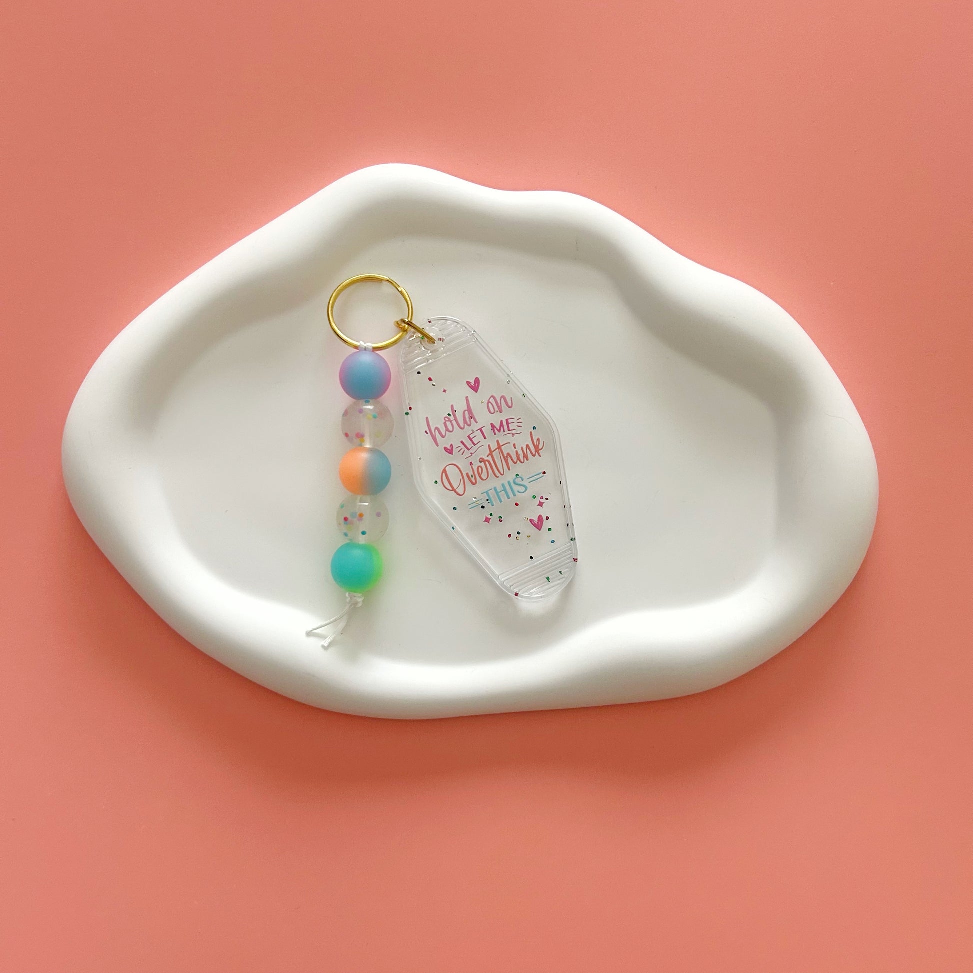 Add a splash of fun to your everyday essentials with this playful acrylic keychain. Featuring the phrase "Hold on, let me overthink this," it’s a perfect little reminder to embrace your thoughtful side with a smile. Durable and lightweight, this keychain keeps your keys organized while showing off your quirky personality.