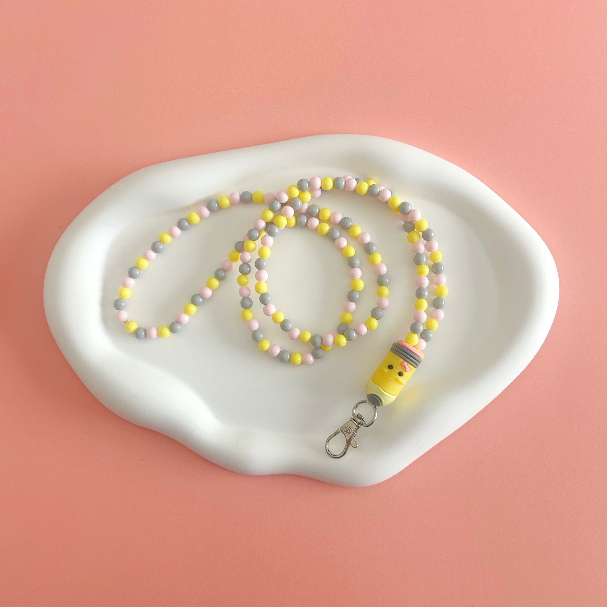 Add a splash of fun to your school day with this playful pink, yellow, and gray beaded lanyard. Featuring a charming pencil-shaped focal bead, it’s the perfect accessory for teachers who want to keep their ID or keys handy while showing off their love for the classroom. Lightweight and colorful, this lanyard brightens up any outfit and keeps essentials close at hand.