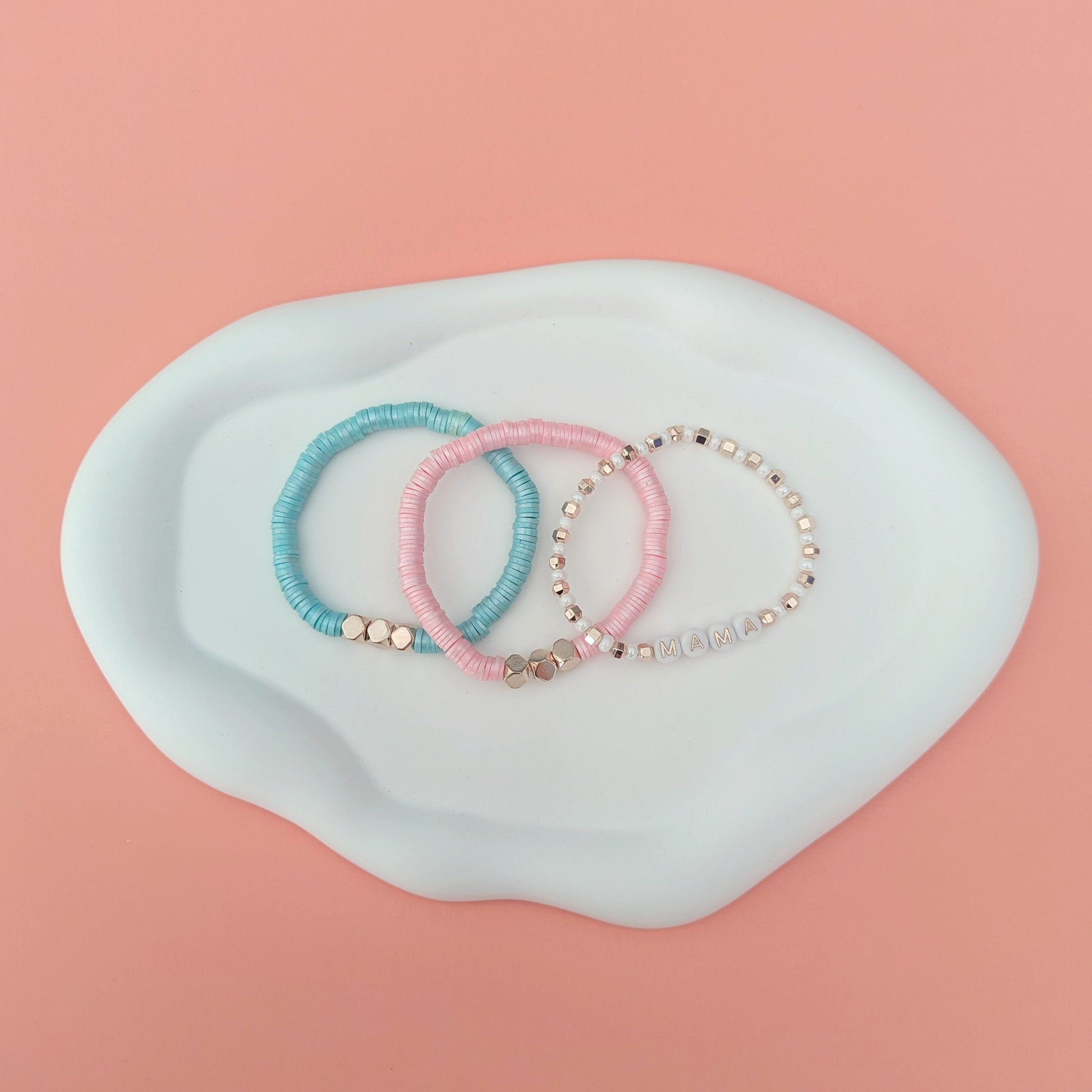 Enhance your style with our Mama Bracelet Stack. Featuring a subtle and unique combination of pink, blue, and rose gold, this stack adds a touch of elegance to any outfit. Elevate your look and show off your unique sense of fashion with our stylish bracelet stack.