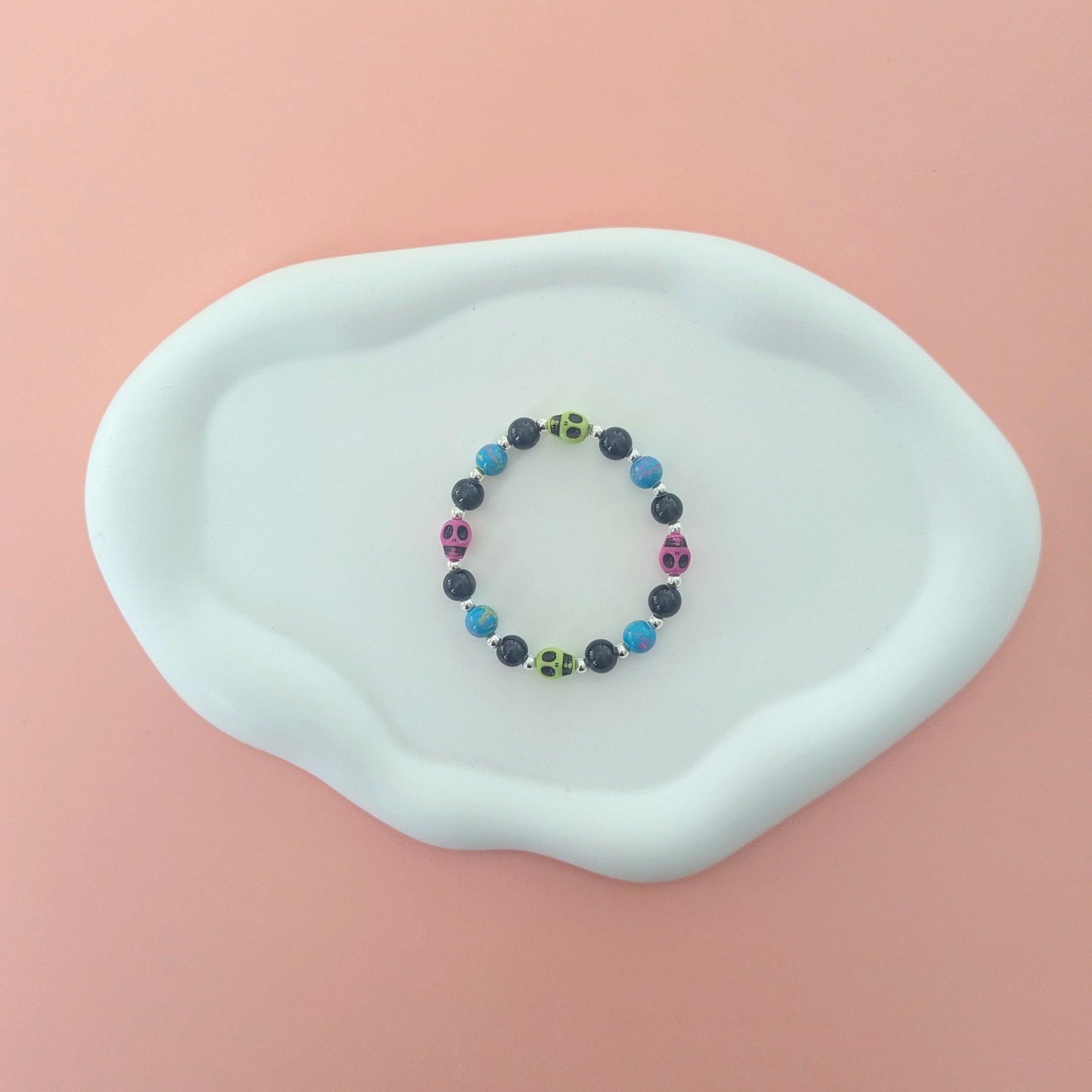 This Pink and Green Skull Bracelet features an eye-catching combination of bright green and pink skulls, perfect for adding a spooky touch to your Halloween ensemble. Made from high-quality materials and designed with attention to detail, this bracelet is a must-have for any skull lover.