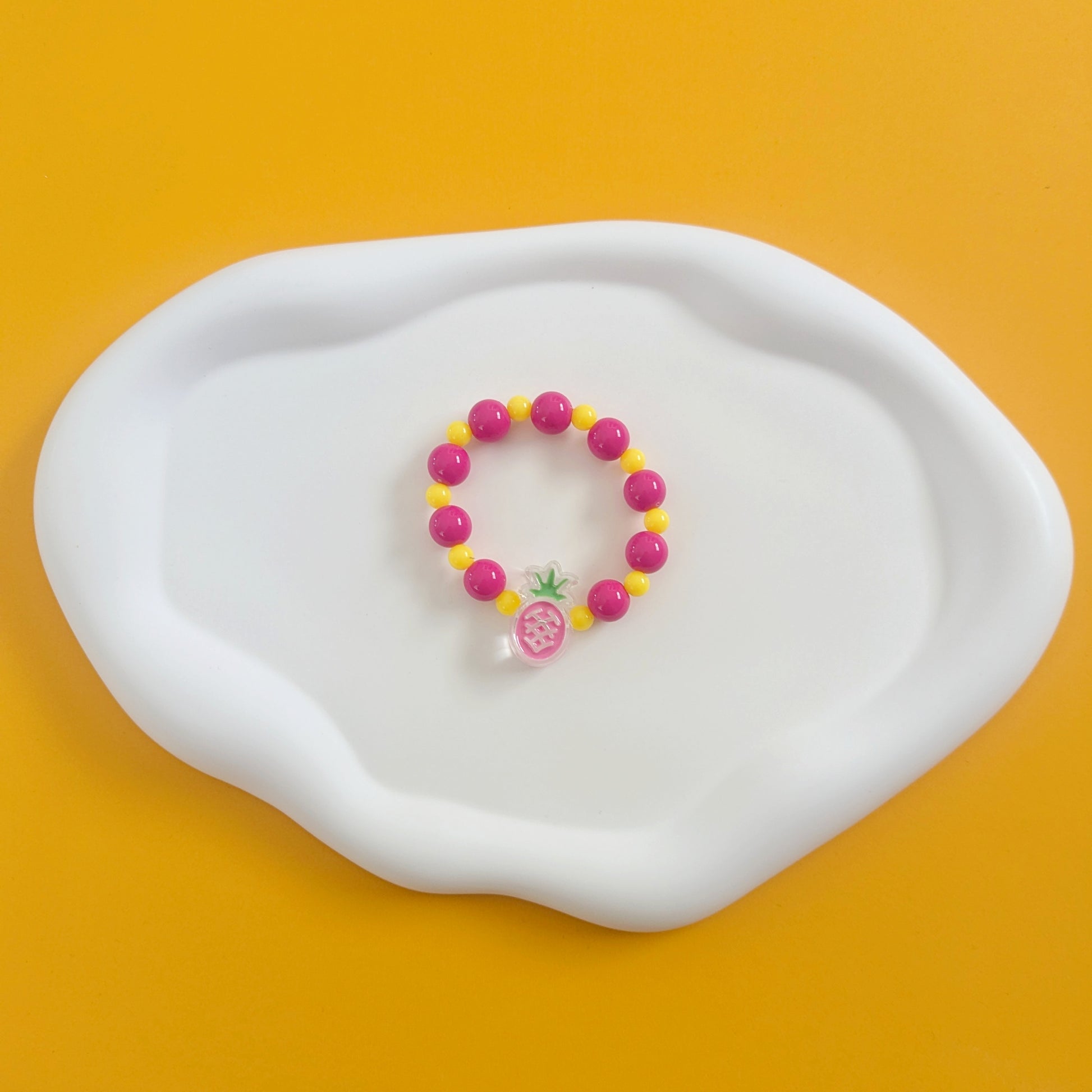 This Pink Pineapple Bracelet is perfect for kids who love sweet and tropical styles. The pink and yellow colors make it a fun and vibrant accessory for any outfit. Made with high-quality materials, this bracelet is a must-have for any fashionable child.