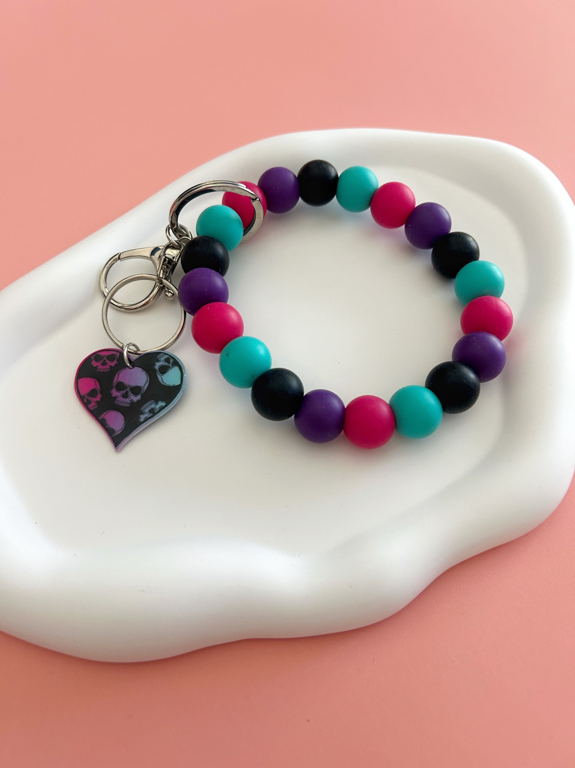 Add a splash of edgy fun to your everyday essentials with this Skull Charm Wristlet Keychain. Featuring a stylish wristlet adorned with black beads and vibrant pops of teal, pink, and purple, it’s perfect for keeping your keys close and your style bold. The skull heart charm adds a playful twist, making it a standout accessory that’s both practical and eye-catching.
