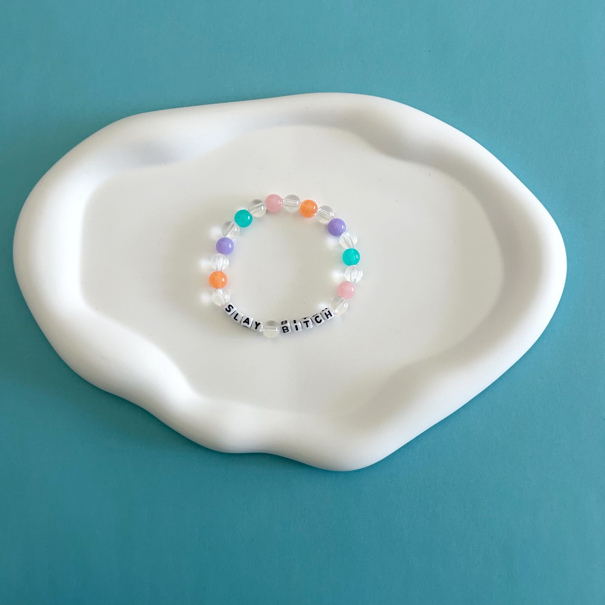 Add a bold pop of personality with this playful Slay Bitch Bracelet. Featuring clear beads accented by vibrant colorful beads, it spells out a confident message that’s perfect for anyone ready to own their power and style. Wear it solo or stack it for a fun, fearless look that says you’re here to slay every day.