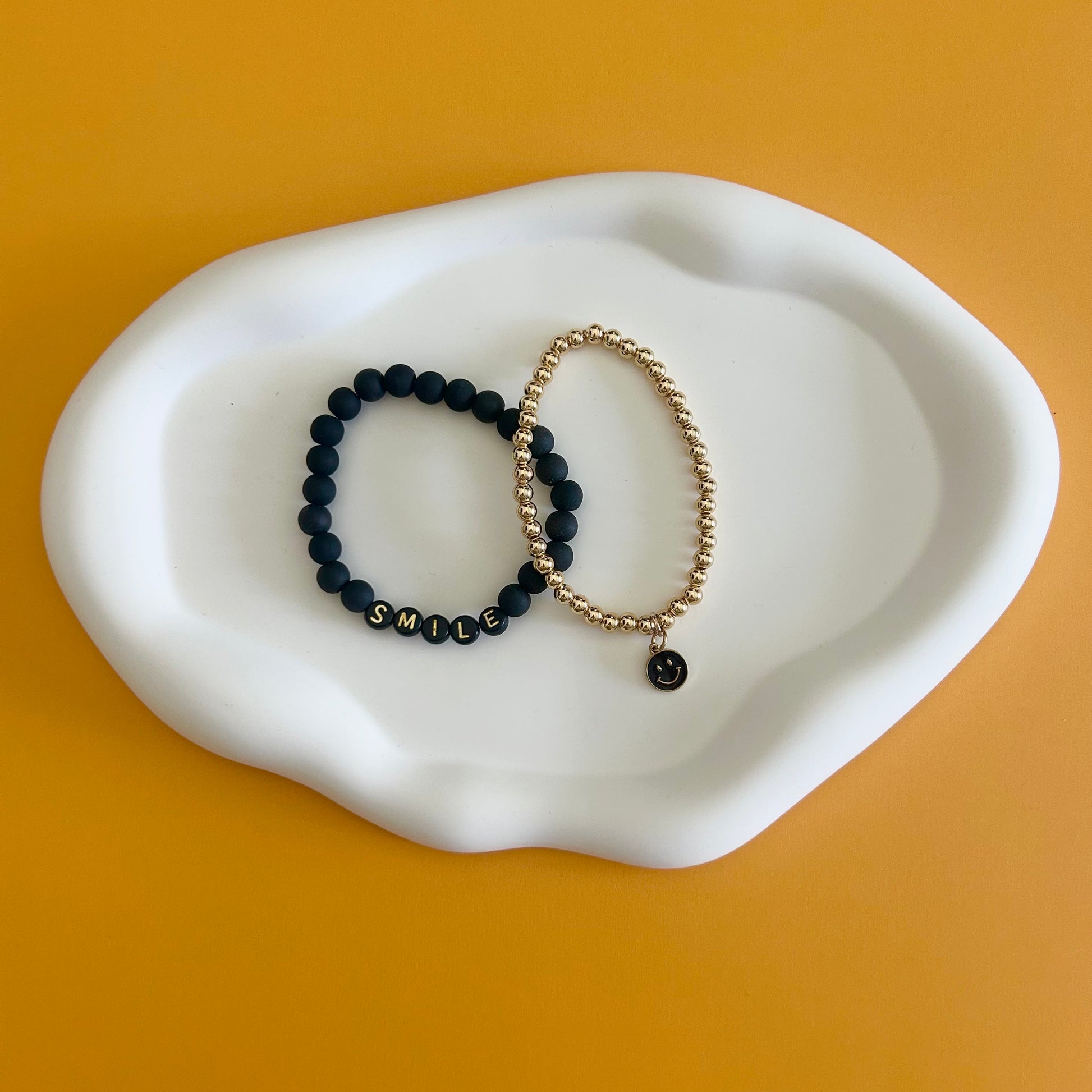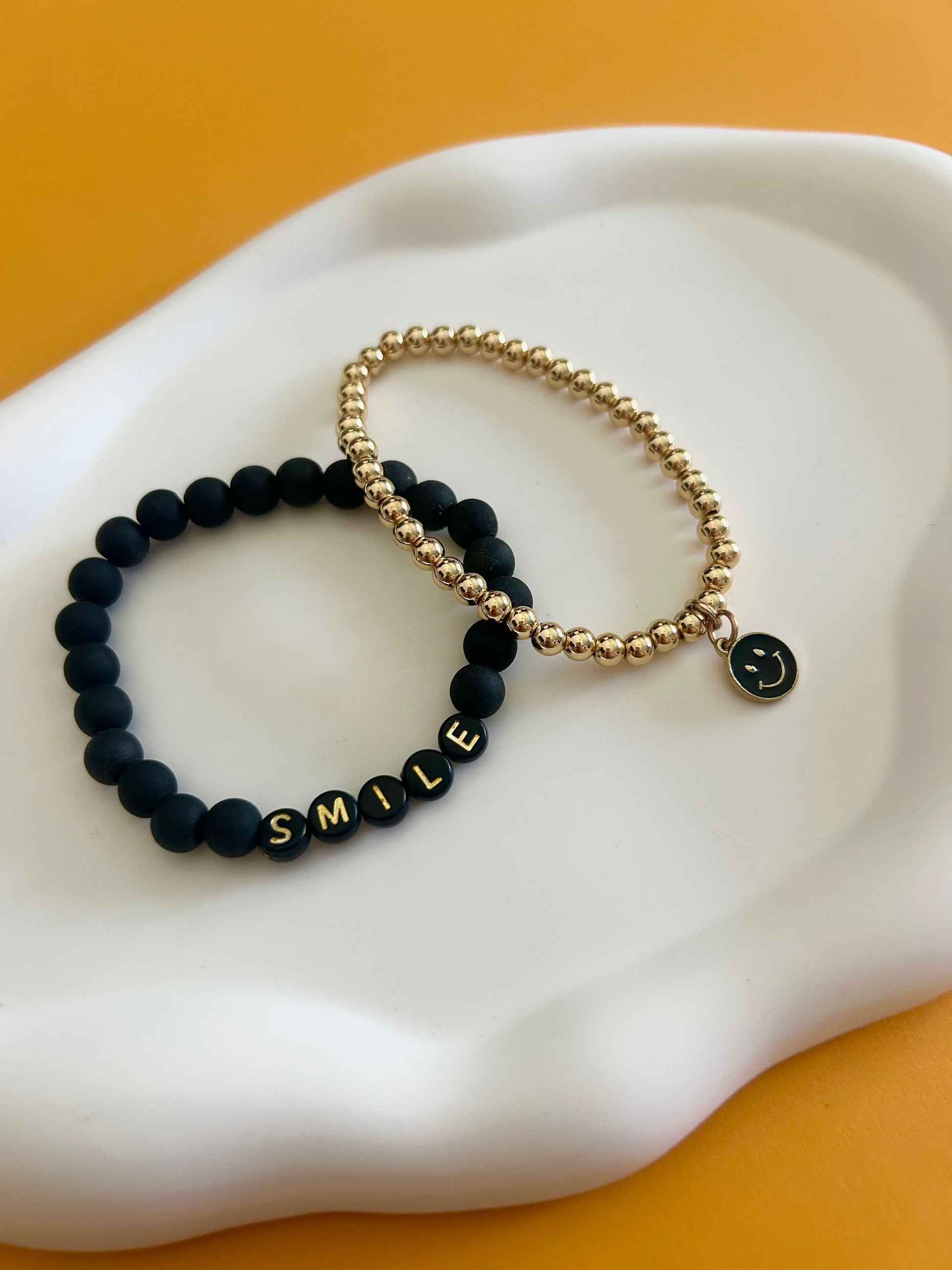 Add a touch of joy to your look with this playful 2-bracelet stack. One sleek black band pairs perfectly with a shiny gold one, featuring a charming black smiley face charm that’s sure to brighten your day. Wear them together for a fun, stylish reminder to smile!