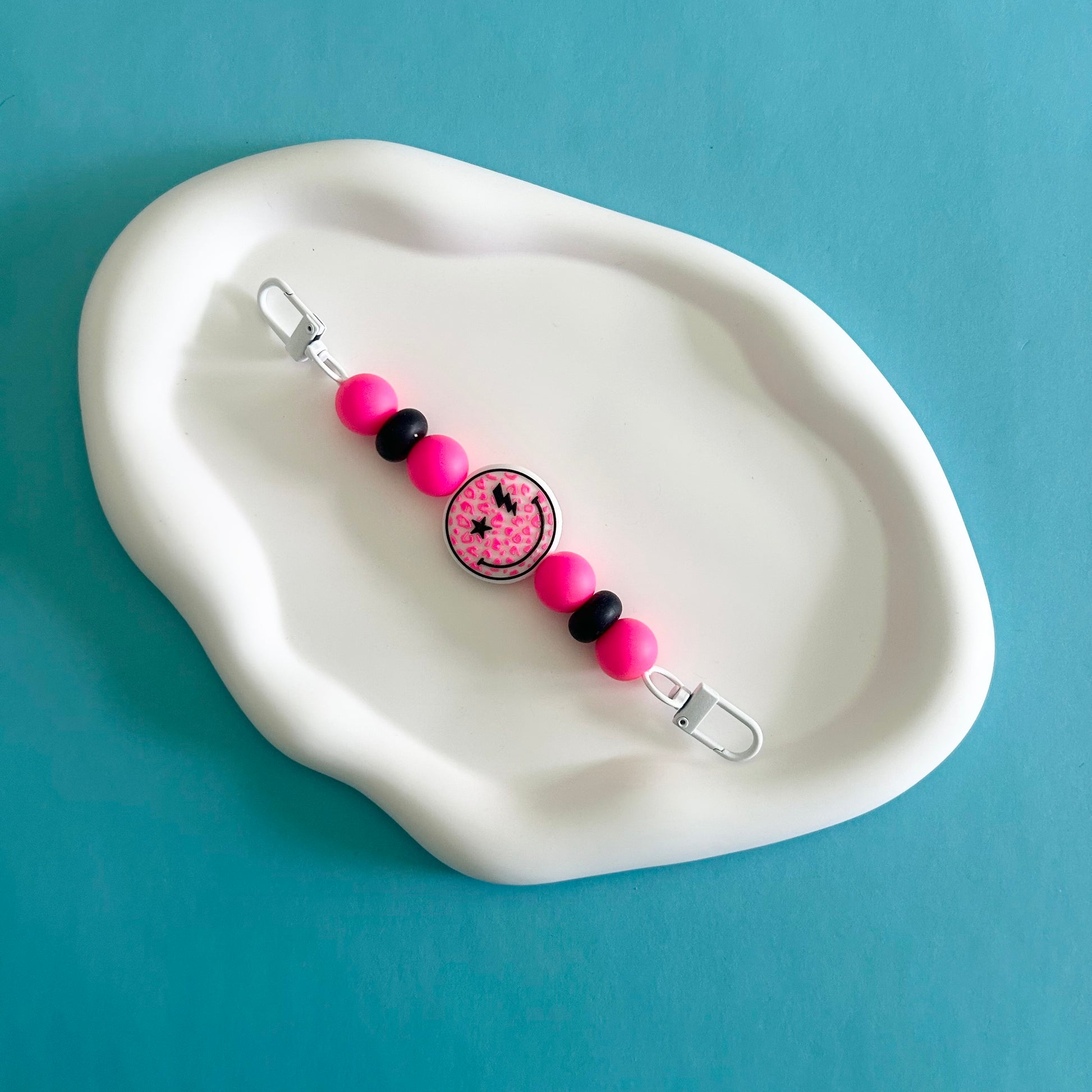 Add a splash of fun to your Kindle with this playful strap featuring neon pink and black beads. The standout focal bead showcases a pink cheetah print smiley face with star and lightning bolt eyes, making your reading accessory truly unique and full of personality. Perfect for brightening your day while keeping your Kindle secure.