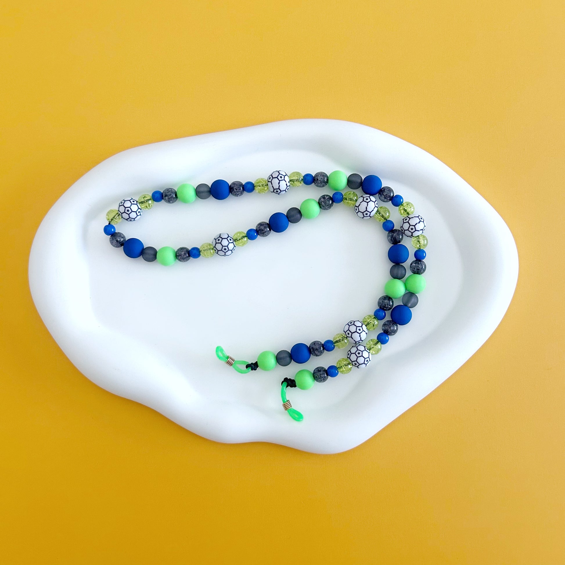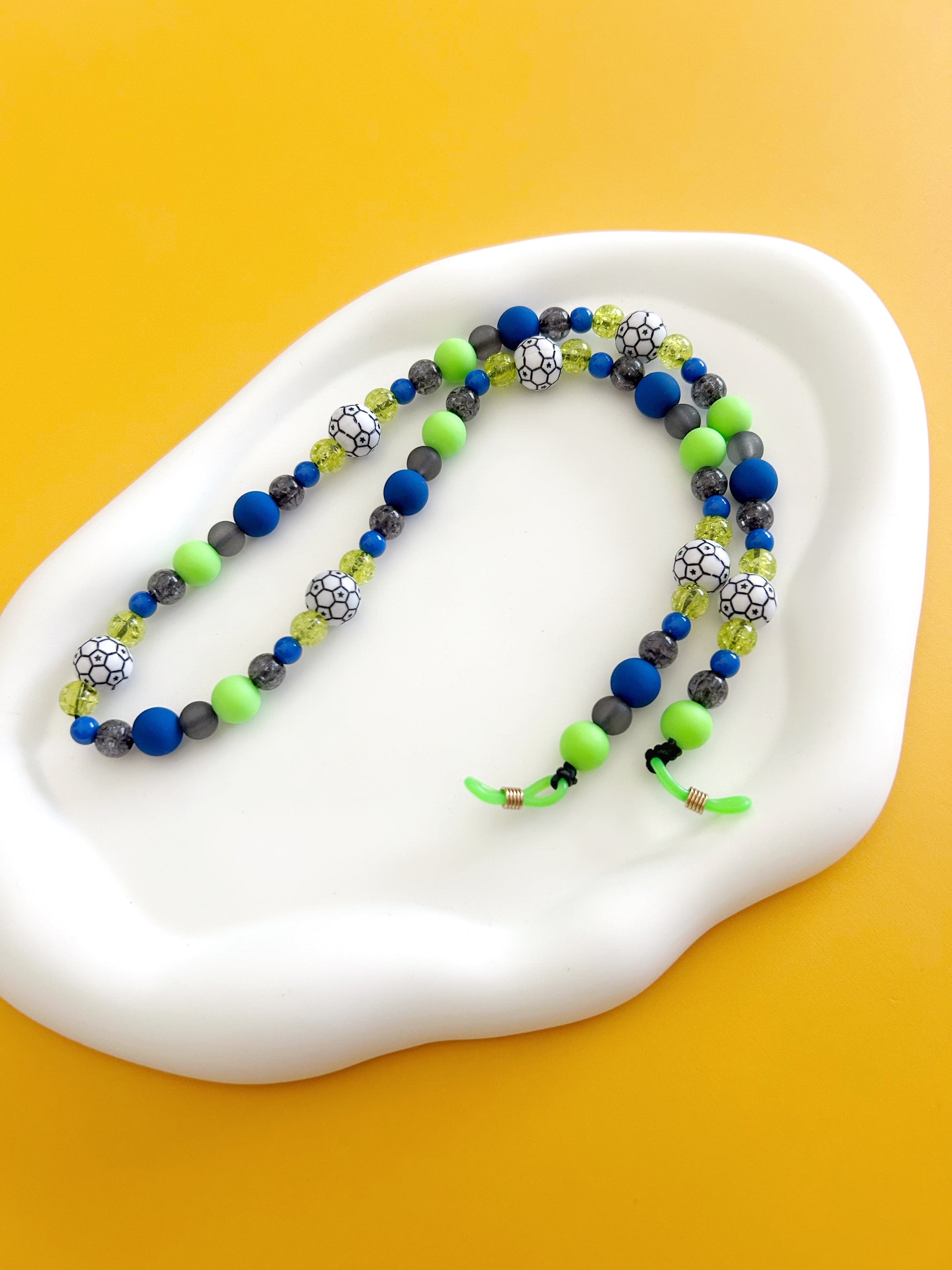 Keep your little soccer star’s sunglasses secure with this playful Soccer Sunglass Strap. Featuring vibrant green, blue, and black accent beads alongside fun soccer-themed beads, it adds a sporty touch while preventing lost shades during active play. Perfect for game days and outdoor adventures!