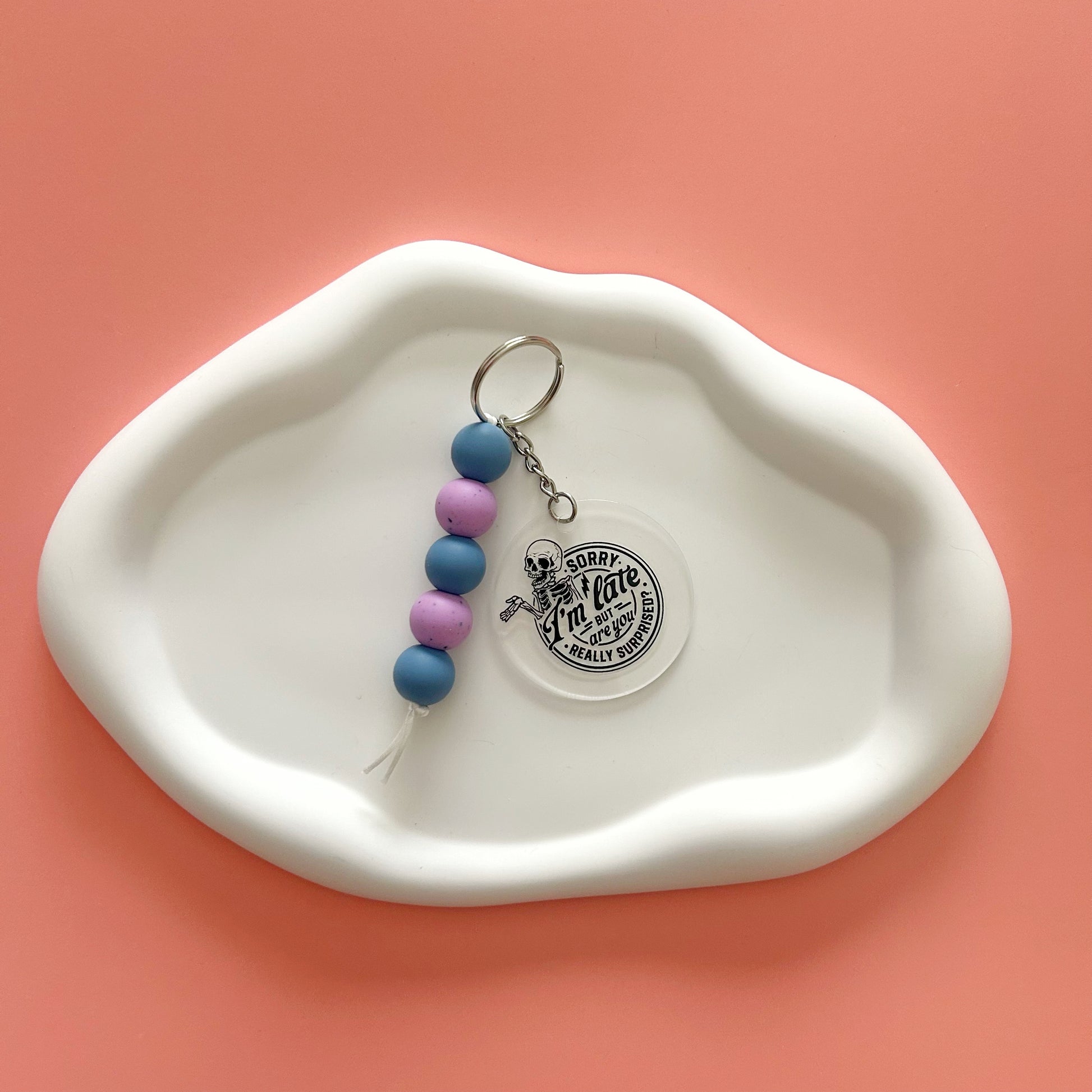 Carry a dose of humor wherever you go with this playful acrylic keychain. Featuring the cheeky phrase "Sorry I'm late but are you really surprised," it’s perfect for those who embrace their fashionably late moments with a wink. Durable and lightweight, this keychain brightens your keys while making a fun statement.
