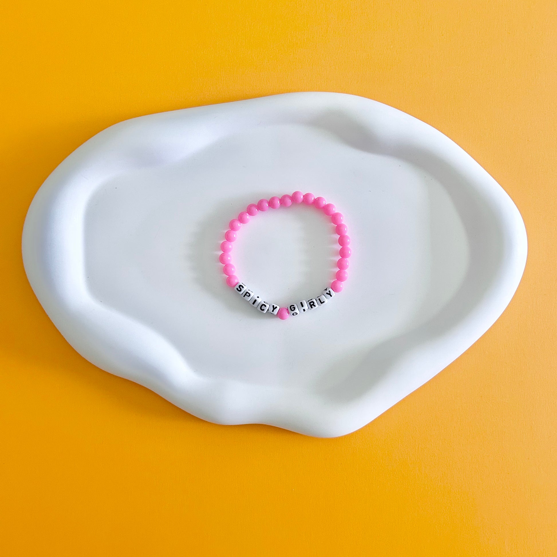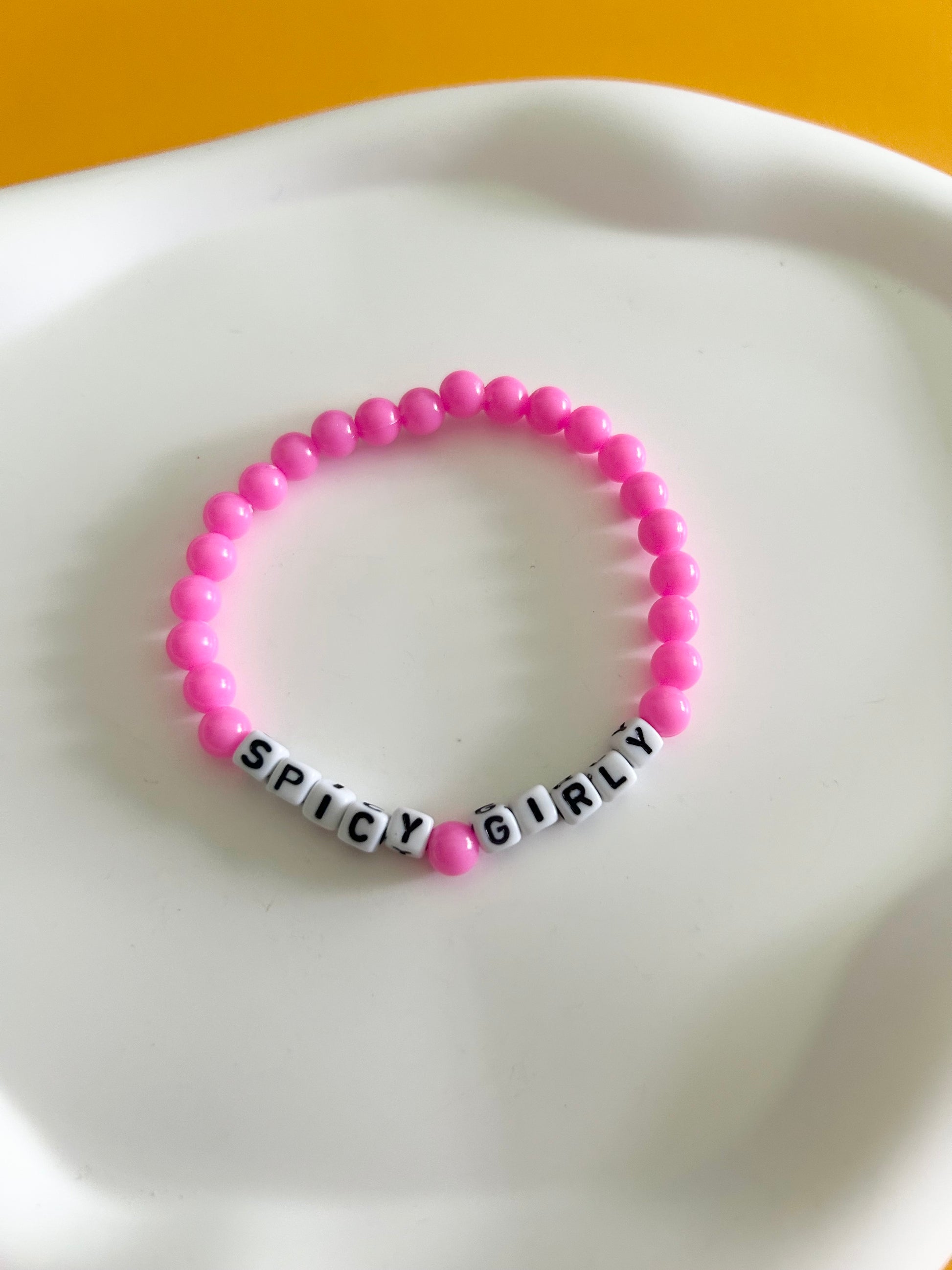 Add a pop of fun to your look with this playful pink bracelet featuring the cheeky phrase "Spicy Girly." Perfect for expressing your bold and sassy side, it’s a cute accessory that brings a little extra personality to any outfit.