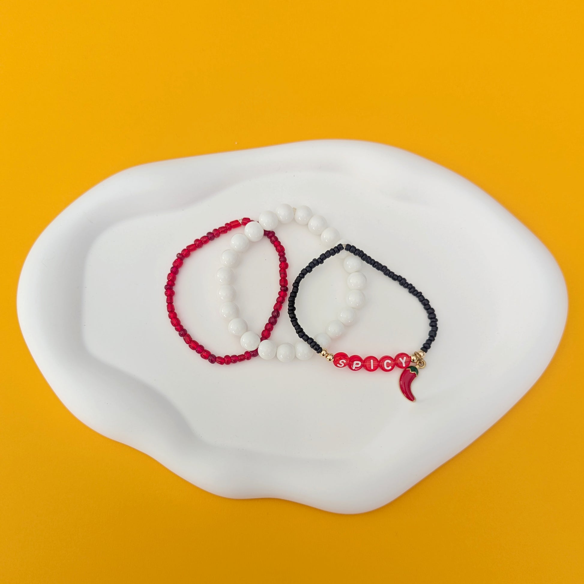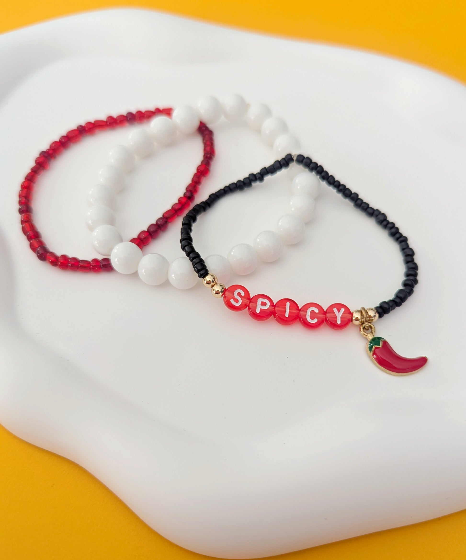 Take on the heat with the Spicy Stack! This bracelet stack features a daring blend of pepper-inspired colors - red, white, and black - to create a bold look that's perfect for those who love to spice things up. Don't be afraid to add some heat to your outfit with the Spicy Stack!