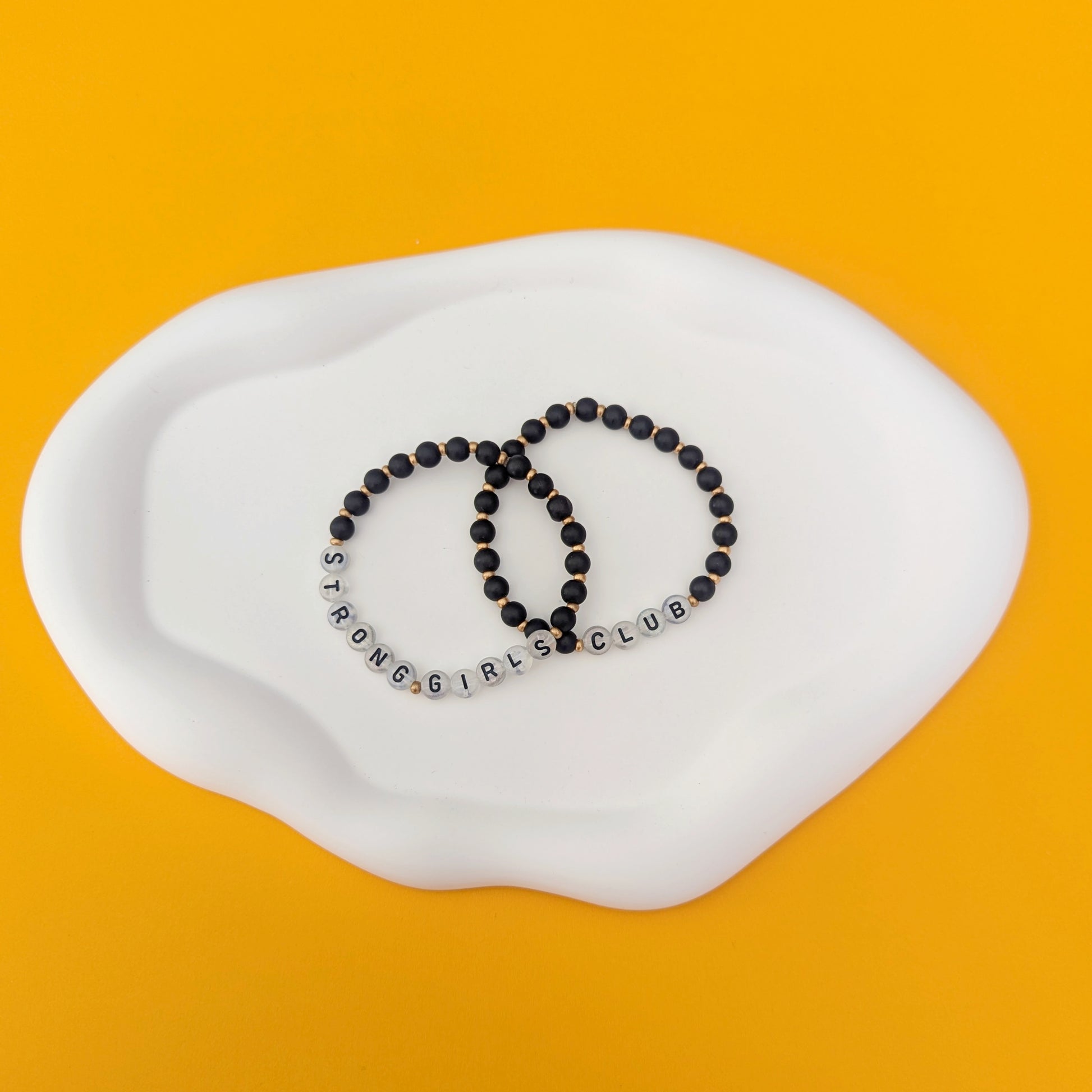Empower yourself with our Strong Girls Club Stack. This bold bracelet stack in black and gold exudes girl power, making a statement and reminding you of your strength. Join the club and feel confident and supported in your daily life.