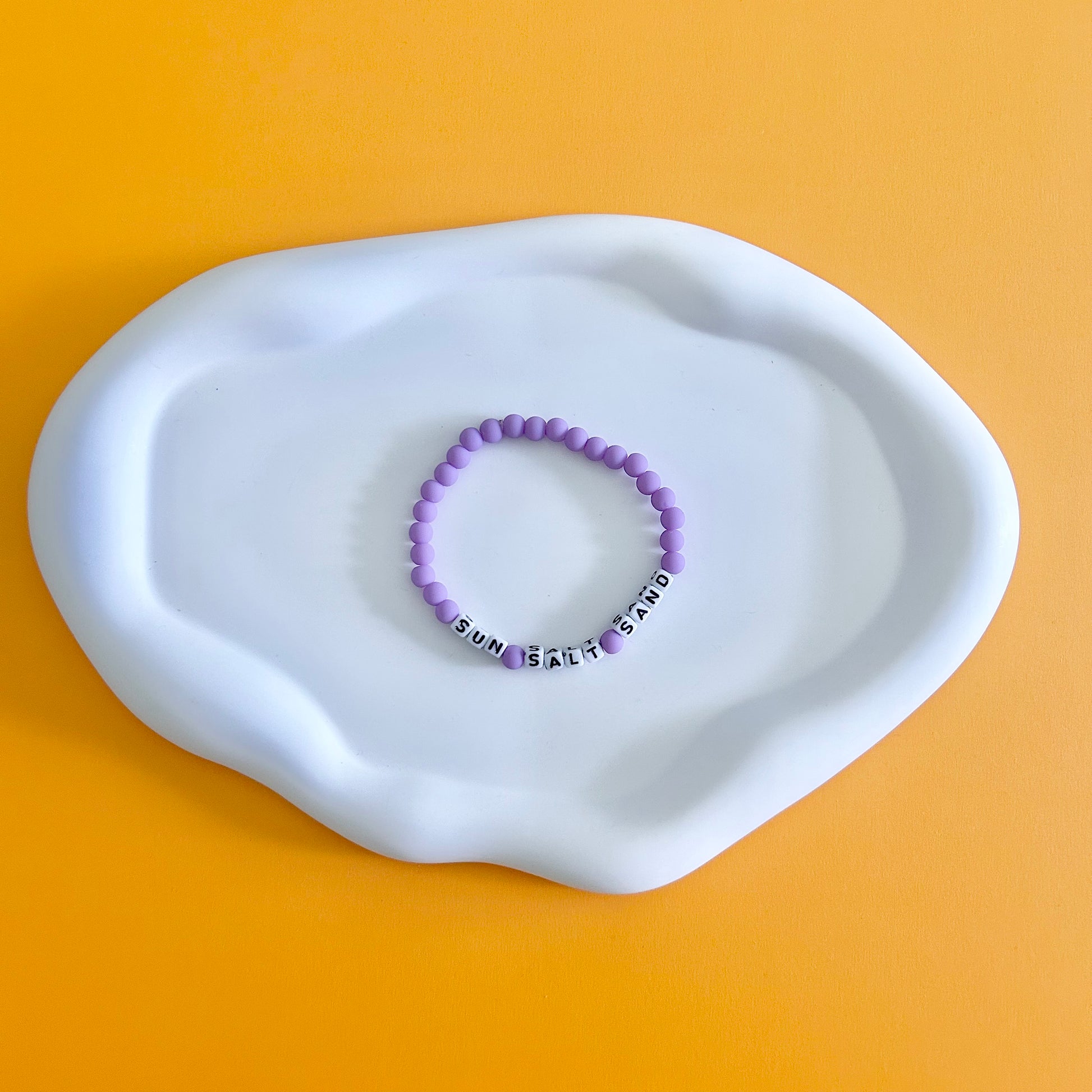 Add a splash of sunshine to your wrist with this playful purple bracelet featuring the cheerful words "Sun Salt Sand." Perfect for beach lovers and daydreamers alike, it’s a fun reminder of sunny days and salty breezes wherever you go.