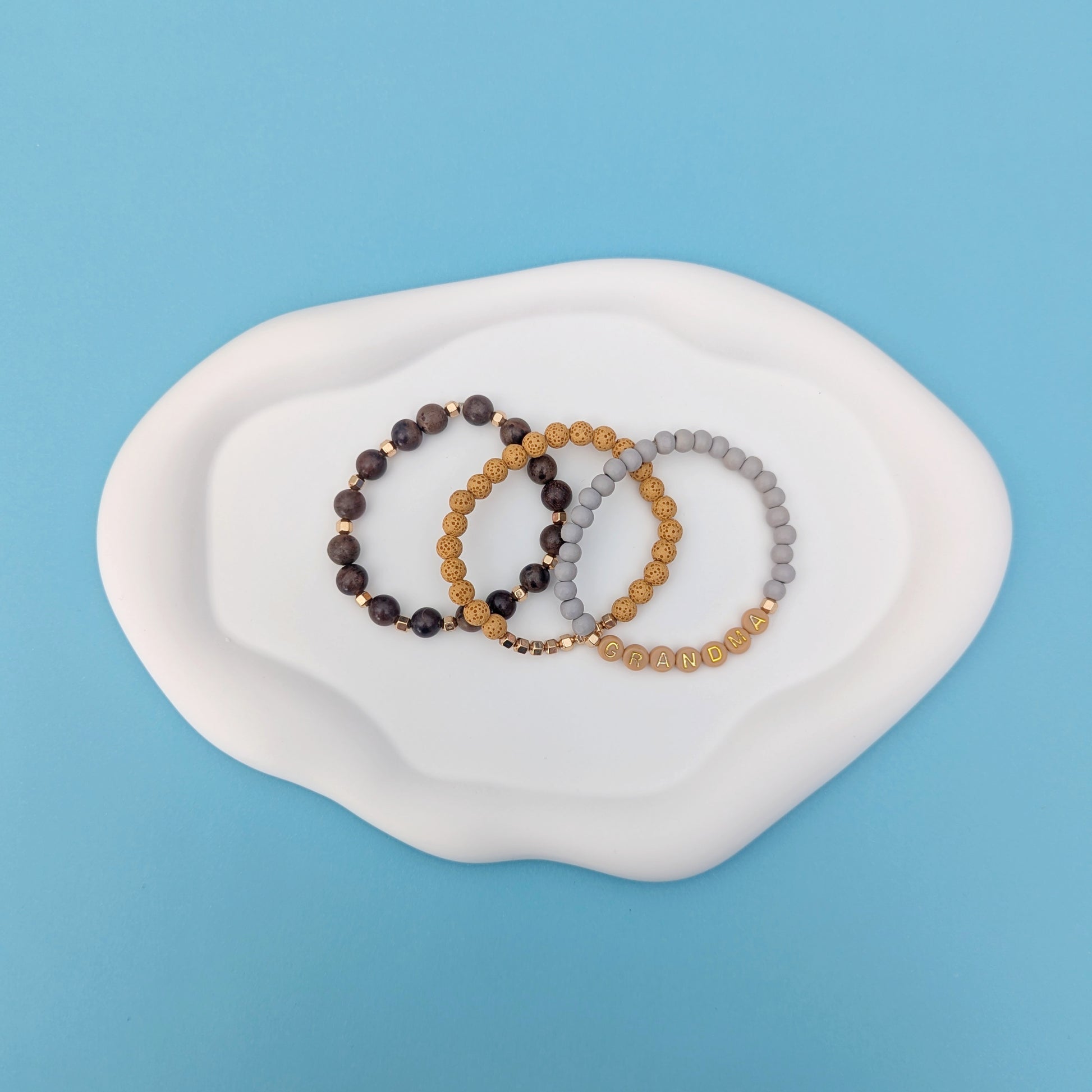 Add some funky flair to your outfit with this Grandma Bracelet Stack! With yellow lava stone beads and earthy wooden beads, this stack will bring playful vibes to any look. (Bonus: a potential conversation starter about cool grandmas!)